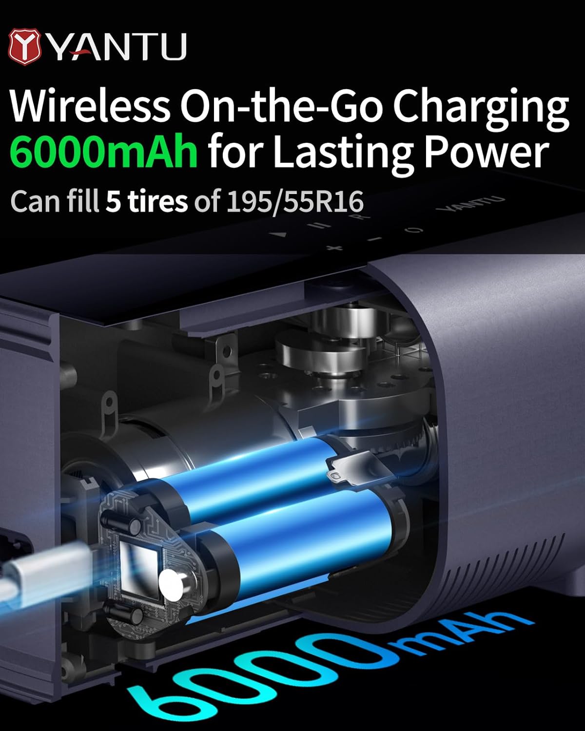 - 【Wireless Convenience with Long-lasting Battery】 - Enjoy the freedom of wireless inflation with our cordless tire inflator. Equipped with a Type-C port compatible with various 5V 2A chargers, it offers unparalleled convenience. The 6000mAh large battery can inflate up to 5 tires on a single charge, ensuring you're always prepared. An extra 12V power cable is also included for emergency use, making it the ultimate portable air compressor for car tires