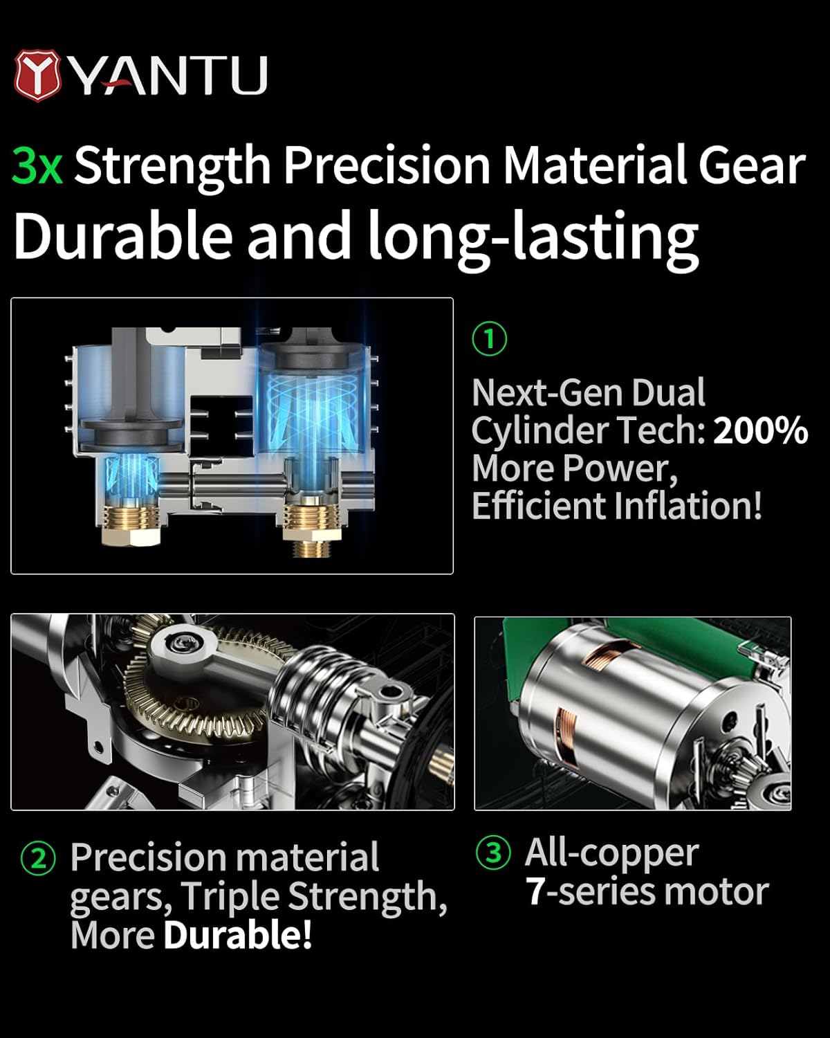 - 【Long-lasting Durability for Years of Use】 - Trust in the durability of our portable air compressor for car tires. Engineered with a dual-cylinder split design for 30% enhanced heat dissipation, it ensures extended lifespan. Featuring a 7-series pure copper movement, it boasts 5 times longer lifespan than competitors. Plus, all-metal gears provide 10 times longer lifespan compared to plastic gears, ensuring reliable performance for years to come