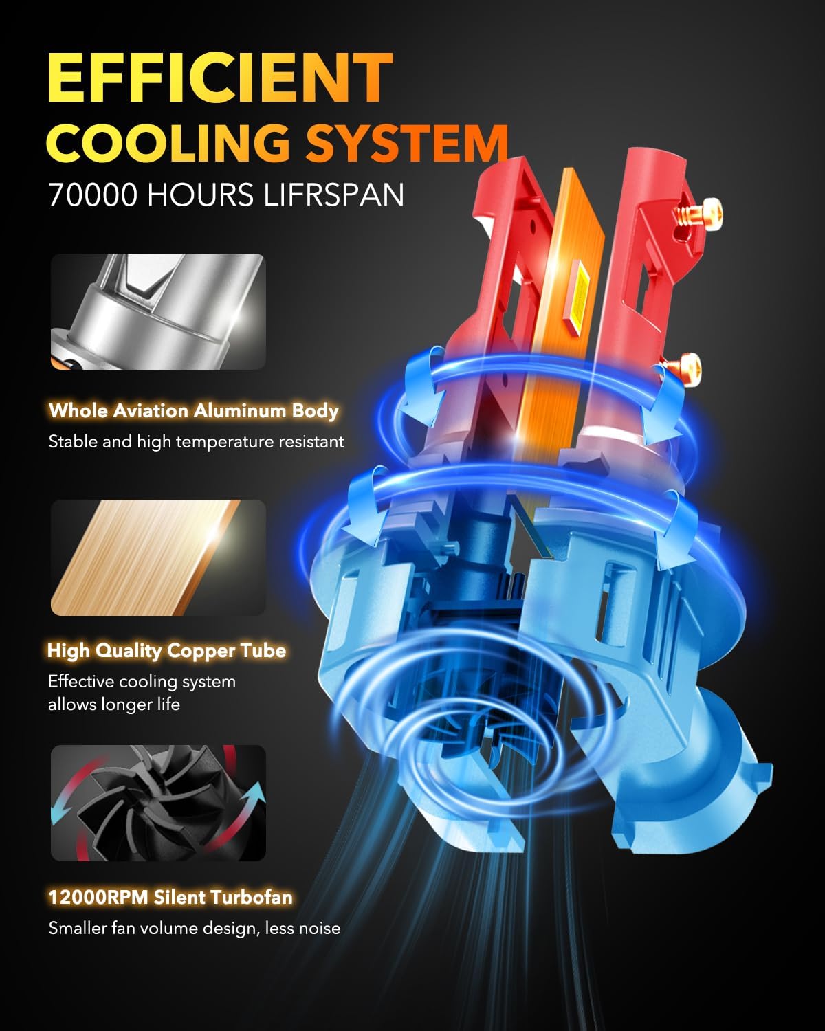 - 【Over 70,000 Hours Lifespan】: Crafted with premium materials including aerospace-grade aluminum alloy and reinforced copper substrate, and featuring a high-RPM cooling fan, this bulb achieves exceptional thermal management. The advanced cooling system enables stable, prolonged illumination, freeing you from the hassle of frequent bulb replacements.