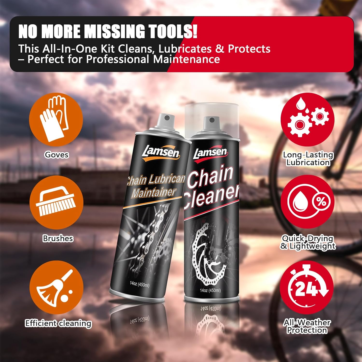Chain Cleaner Kit, Professional Bike Chain Cleaner Set, Motorcycle Cleaning Kit with Chain Cleaner 17oz & Chain Lube 14oz Including Brushes and Gloves for Cleaning and Maintain All Bicycles (1 pack)