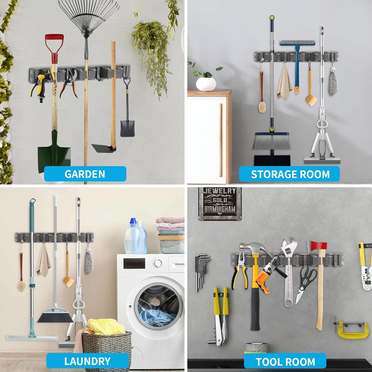 - TOOL ORGANIZER: Crafted with a aluminum finish, this broom holder doubles as functional storage and stylish home decor. It adds a touch of tidy to your laundry room, garage,garden, or utility closet. Our broom hanger much more attractive than plastic organizers.