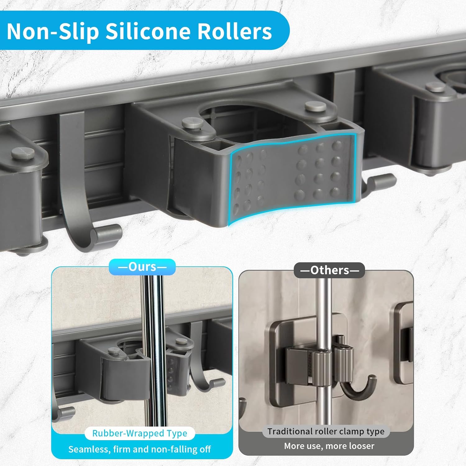 - 2025 UPGRADED DESIGN: This broom holder wall mount features a 15" aluminum base with 3 racks and 4 utility hooks spacing for easy mounting. Perfect for organizing all your cleaning tools while keeping them within reach and off the floor. The anti-slip silicone chuck enhances friction, making the mop hang more durable and firmly. The mop holder with movable slide rail, rack and hooks can move left and right, and the spacing can be adjusted freely.