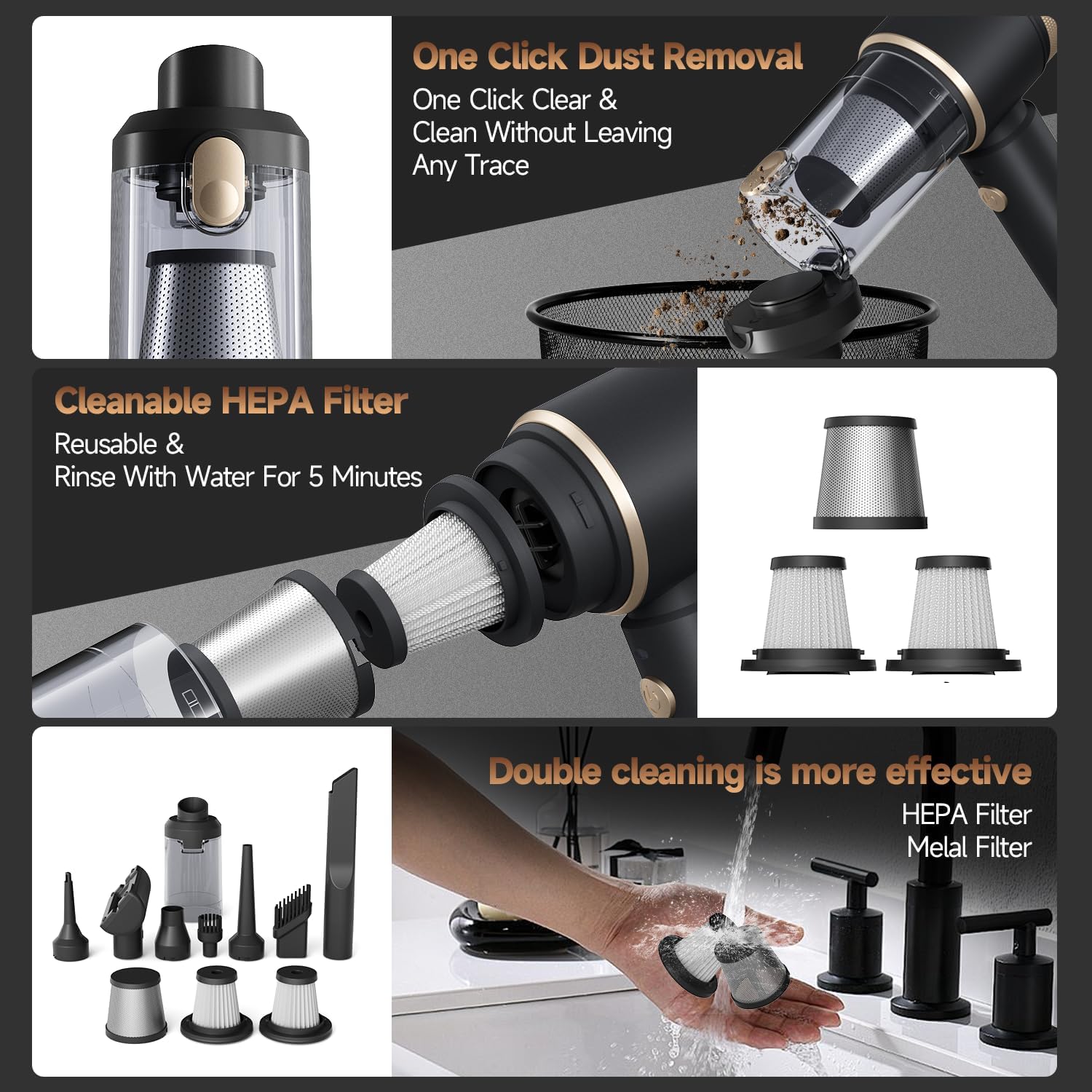 - 【Double Layer Filter Protection - Metal & HEPA filter】The HEPA filter and dust collection box of the mini vacuum cleaner adopt a detachable design. The HEPA filter uses a double-layer filter of metal and cotton cloth to effectively protect impurities and dust from entering the main unit and avoid damaging the motor. It can be cleaned with clean water and reused, extending its service life.