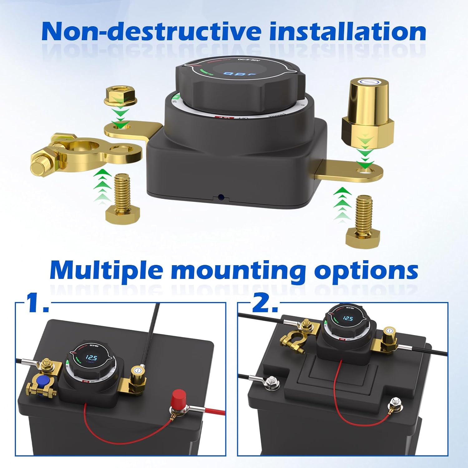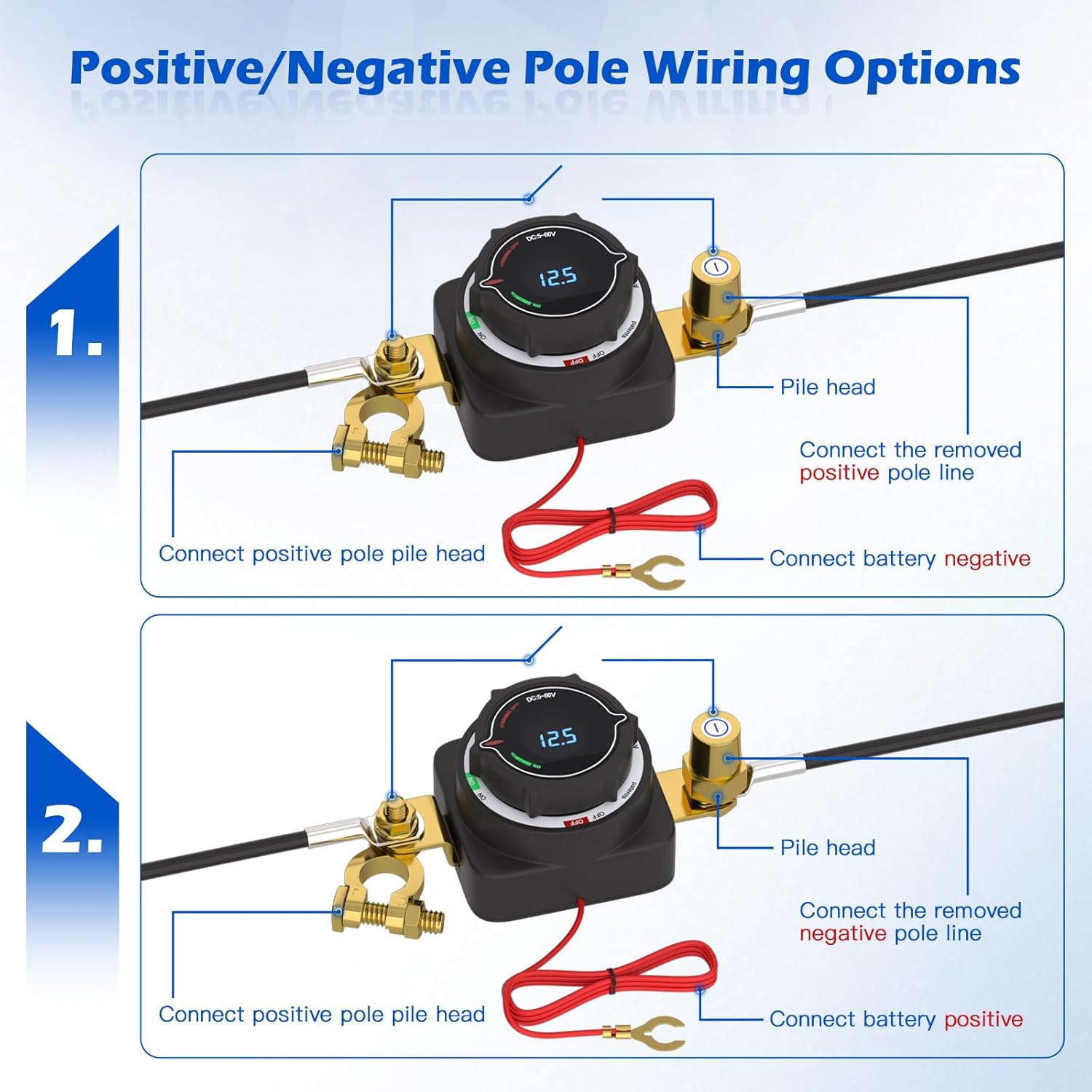 - Real-time LED Voltage Display: With an LED voltage display built into its surface, this top post battery disconnect switch lets you monitor the battery status at a glance. The screen shows real-time voltage when it’s on, and turns off automatically when disconnected