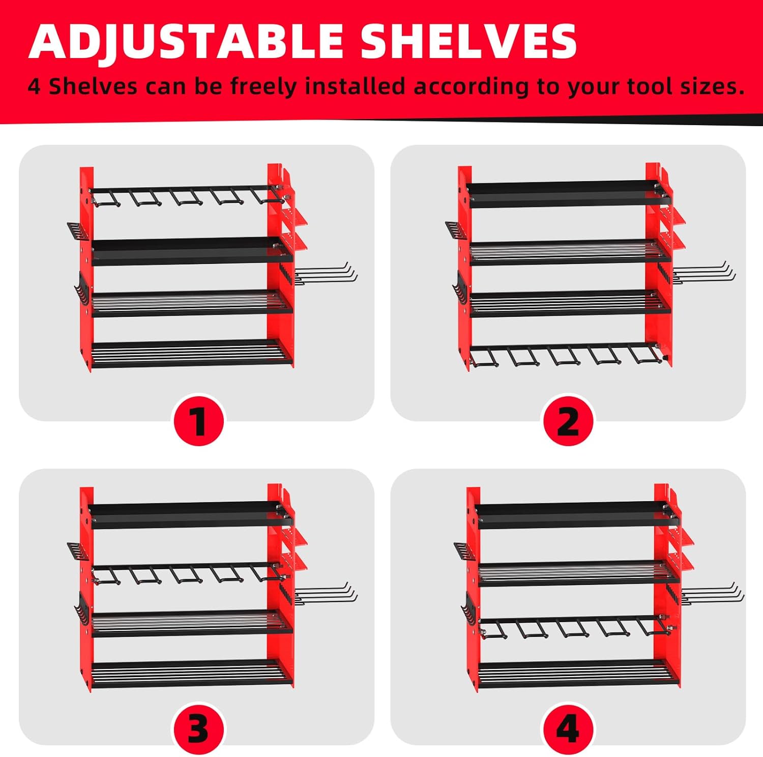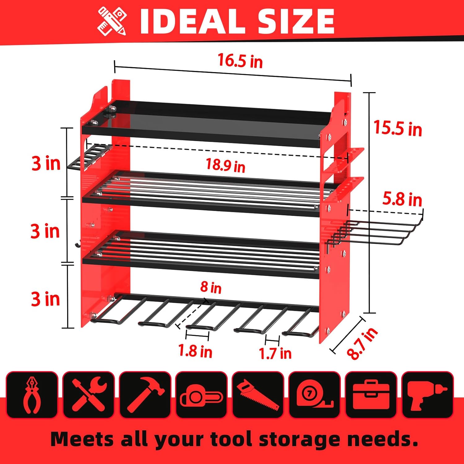 - 🔨【400 POUNDS LOAD】This heavy-duty power tool organizer is made of heavy-duty metal and protective coating,scratch-resistant, rust-resistant and anti-bending,no need to worry about the shelf breaking or falling off the wall. The wall mount design saves valuable floor space while keeping tools within reach,say goodbye to a messy workspace,put your tools all in a row.