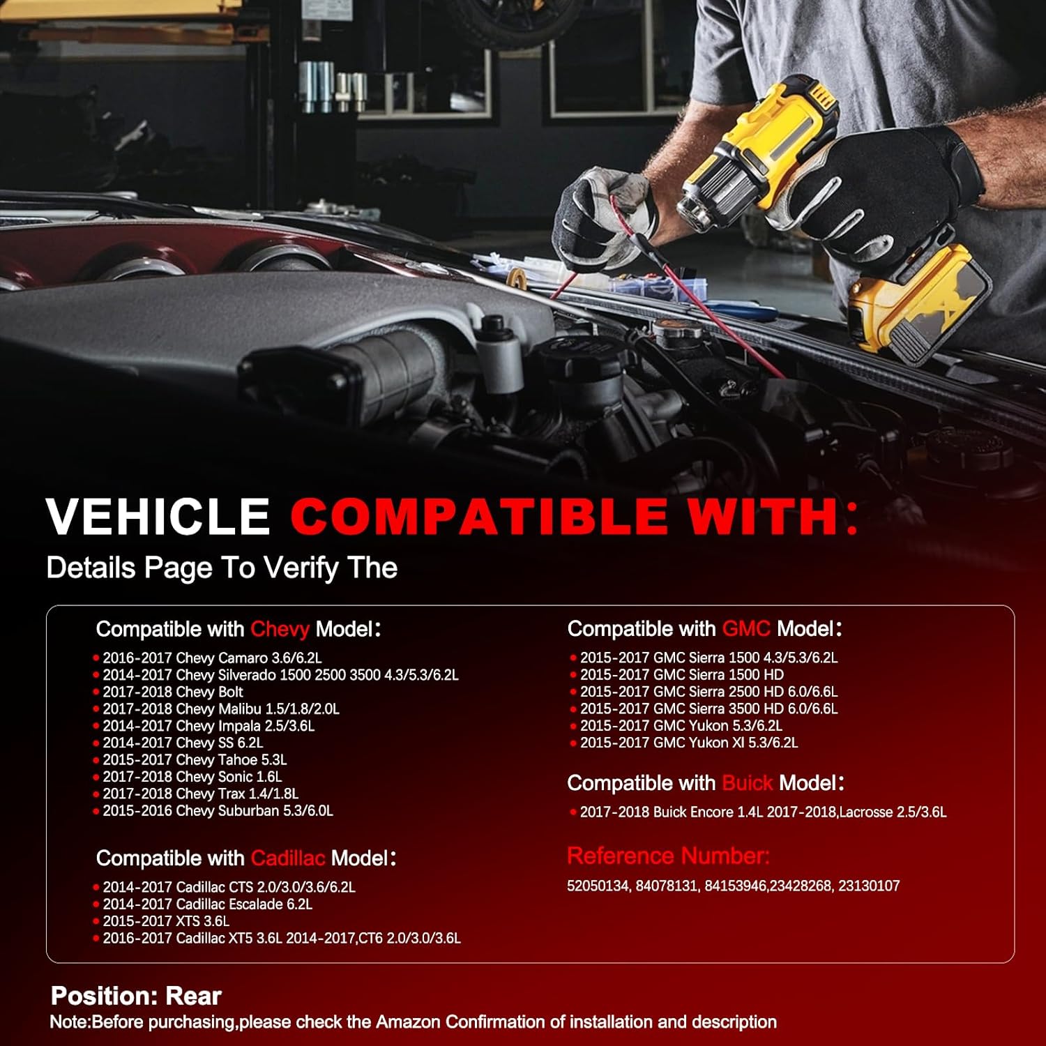 - Fitment:Parking assist sensor Compatible Chevy Camaro 2016-2017 3.6/6.2L,Silverado 1500 2014-2017 4.3/5.3/6.2L,Silverado 2500/3500 2014-2017 6.0/6.6L,Silverado 1500/2500/3500 HD 2014-2017 6.0/6.6L,Bolt 2017-2018,Malibu 2017-20181.5/1.8/2.0L,Impala 2014-2017 2.5/3.6L; For SS 2014-2017 6.2L,Tahoe 2015-2017 5.3L;Sonic 2017-2018 1.6L,Trax 2017-2018 1.4/1.8L,Suburban 2015-2016 5.3/6.0L --Rear Bumper Park Assist Object Sensors.Note:Before purchasing,please check the Amazon Confirmation of installation and description details page to verify the compatibility of this item with your vehicle.