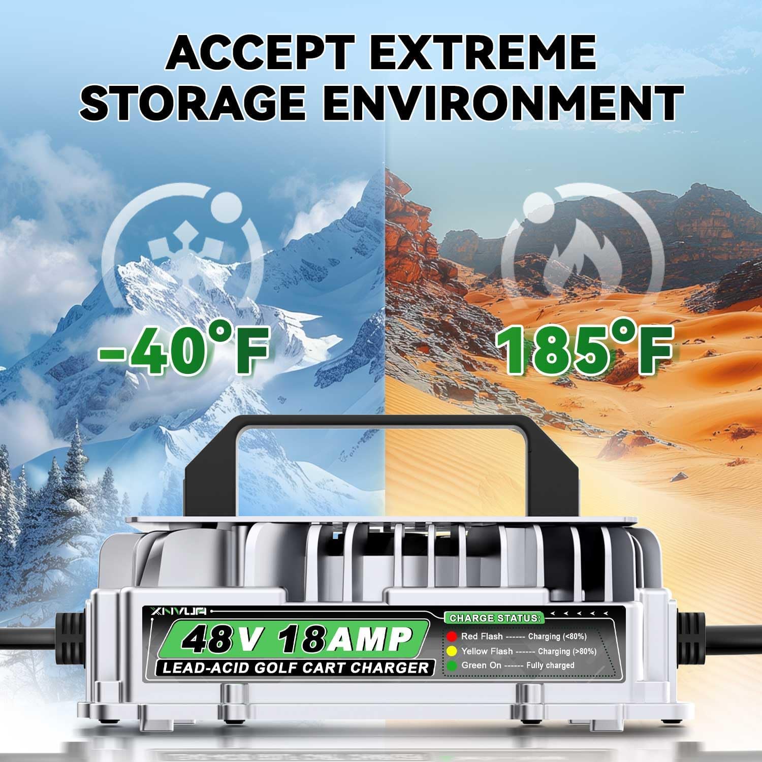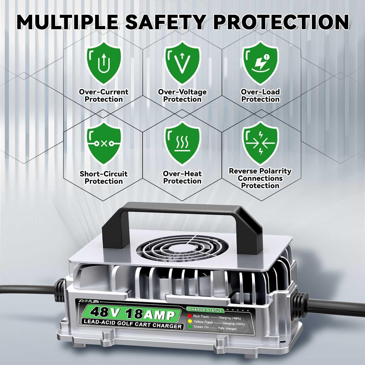 - 【Vortex Heat Dissipation Design】The 48 volt golf cart battery charger for Club Car comes with a cooling fan and is designed with a vortex around it, which greatly increases the cooling efficiency and enables it to work stably.