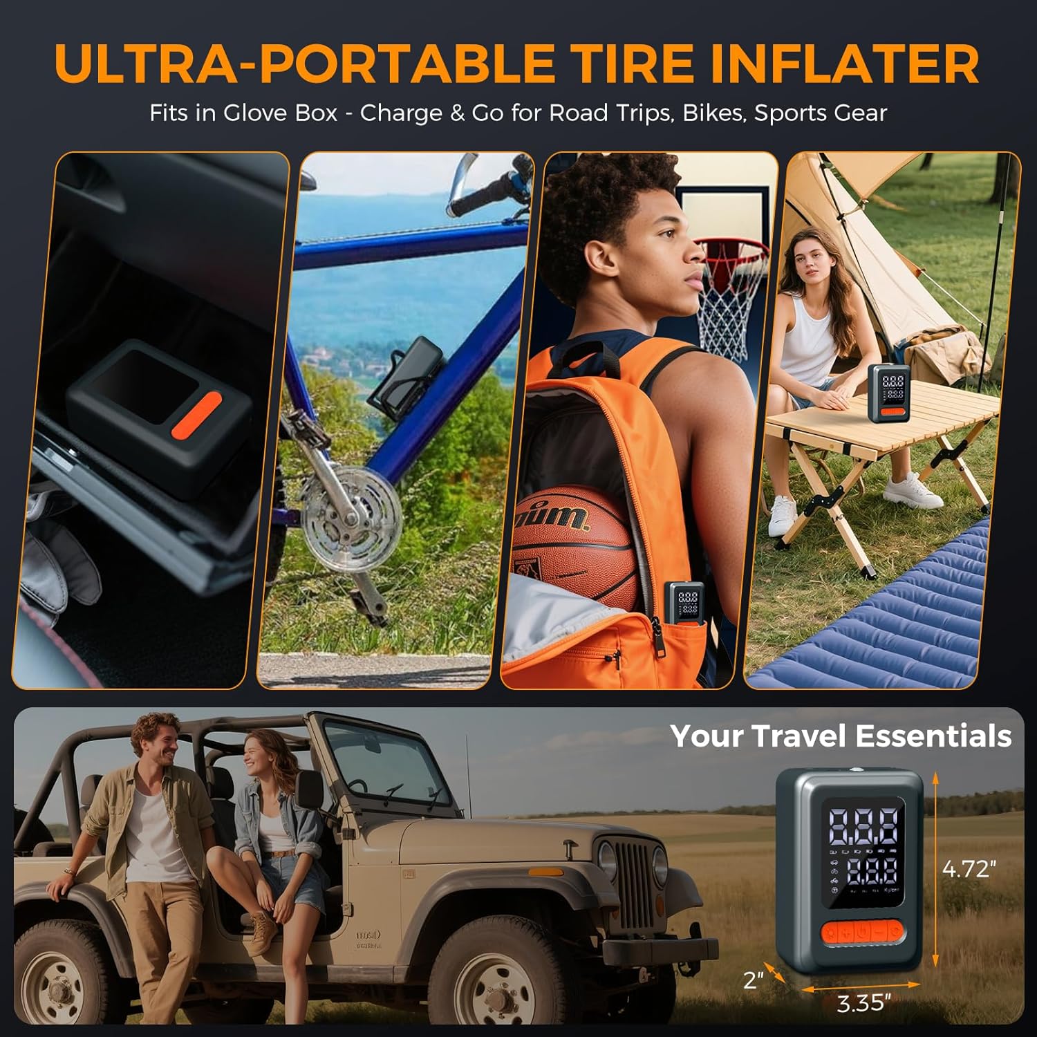 - 3X FASTER INFLATION: Powools portable air pump is born with a powerful motor and a high-performance chip, providing a maximum pressure of 150PSI and a strong airflow. This portable tire inflator for cars can pump up a standard car tire from 30 to 36PSI in less than 1 minute, offering 3X faster inflation than others. It can save you valuable time in emergencies or routine maintenance.