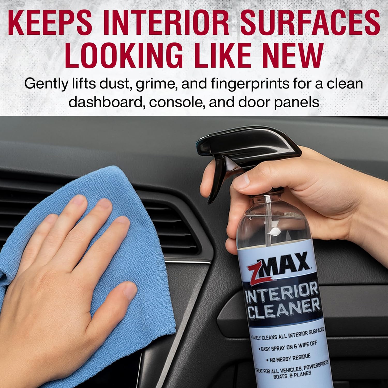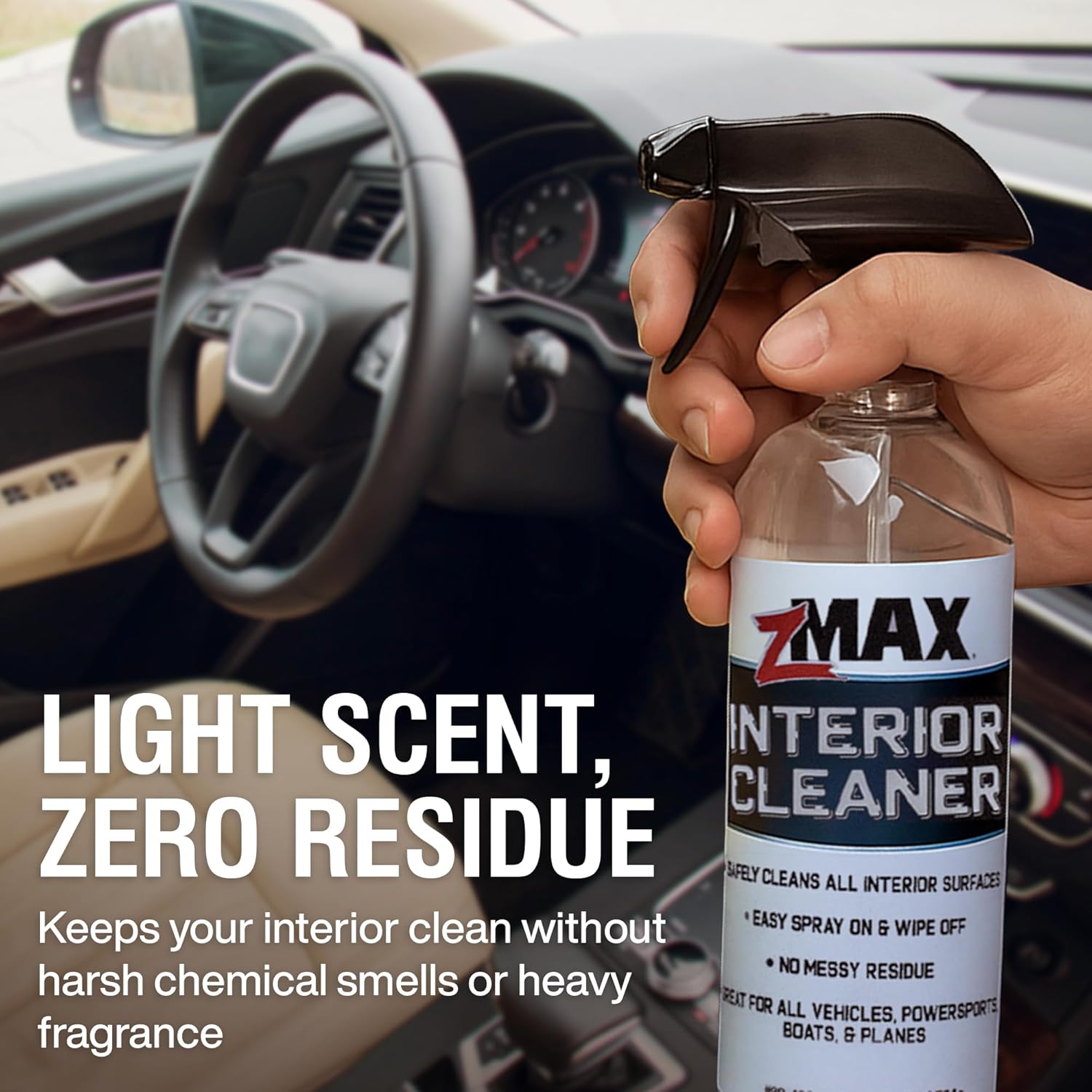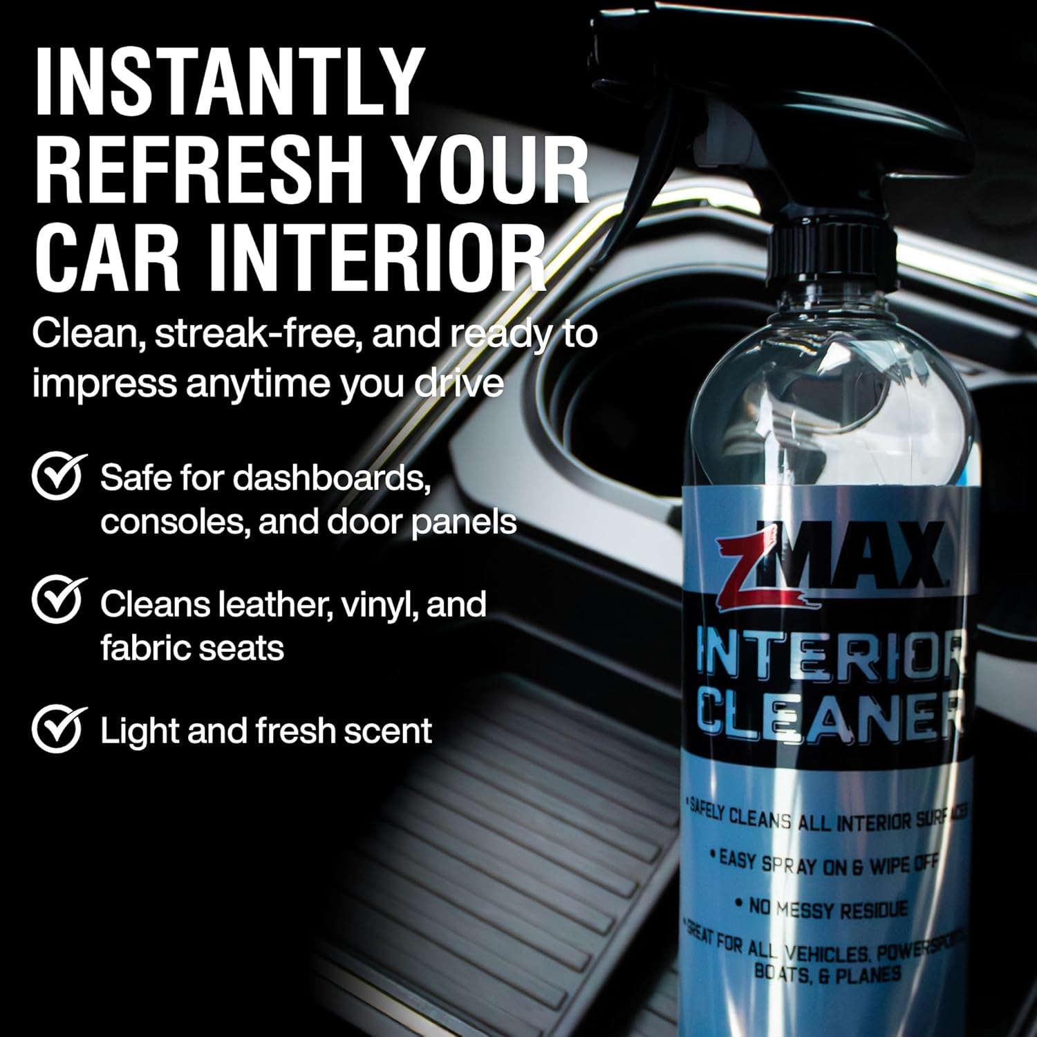 - Tidy Up in Seconds: Keep your interior clean, fresh, and ready when someone hops in. Easily spray and wipe your dashboard, console, cupholders, steering wheel, door panels, and seats with zMAX Interior Cleaner for a quick, satisfying clean.