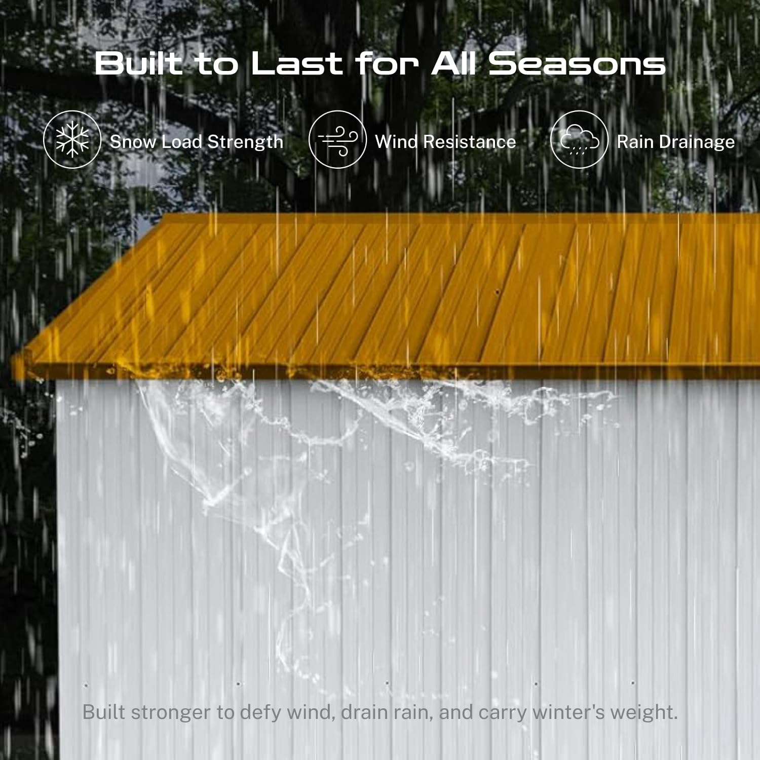 - ☔ [Sloped Roof for Superior Weather Protection] Designed for real-world conditions, the efficient sloped roof system guarantees optimal rainwater drainage, preventing damaging pooling and leaks. This key feature in our storage buildings and sheds clearance design minimizes maintenance and ensures your tools, equipment, and belongings stay consistently dry inside
