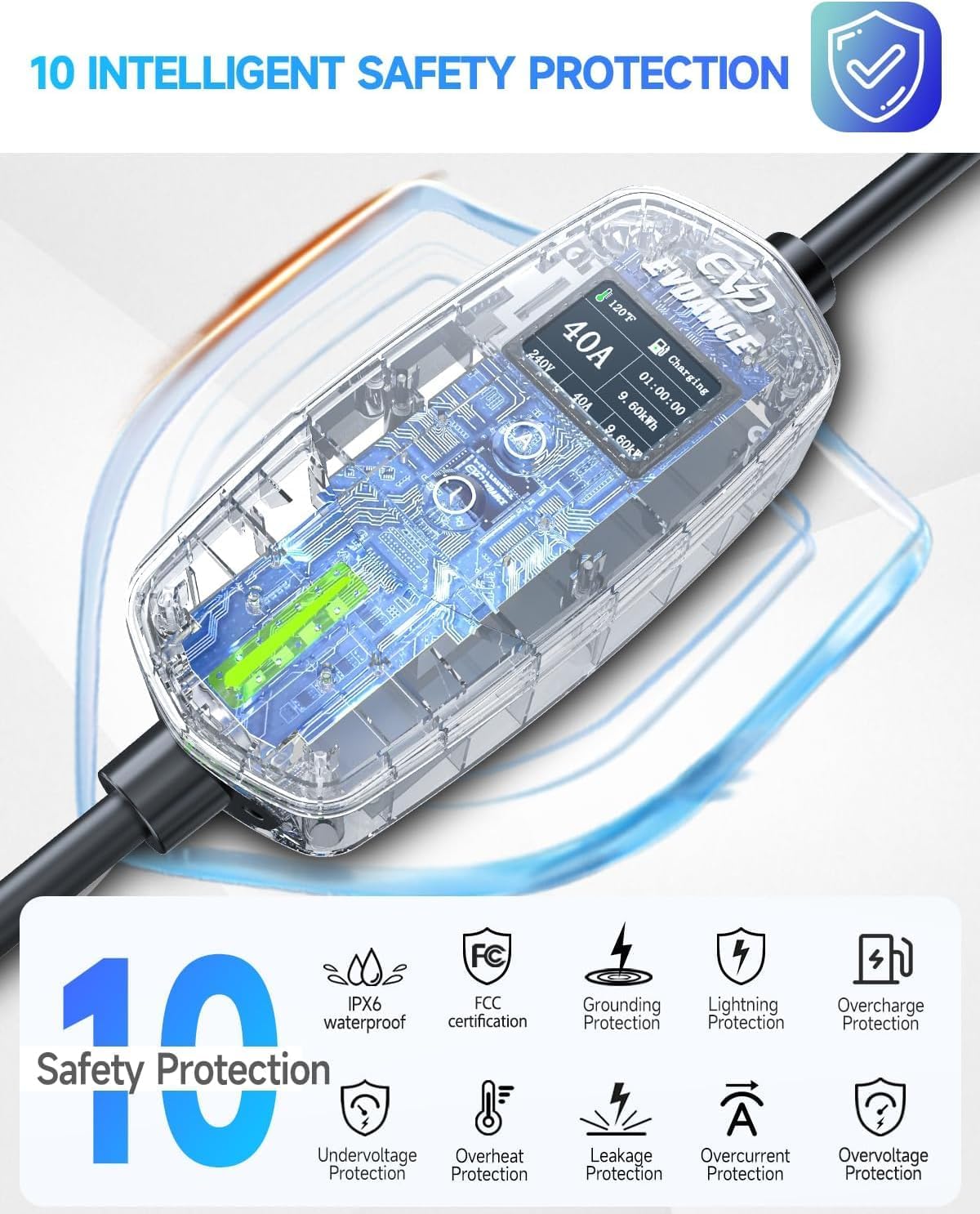- 🔒【 Safety You Can Count On】We don’t just promise safety—we engineer it in. With advanced built-in chip protection, the charger guards against leakage, grounding faults, voltage fluctuations, overcurrent, overheating, and more. It even automatically shuts off once your vehicle is fully charged—protecting both your EV and your peace of mind.