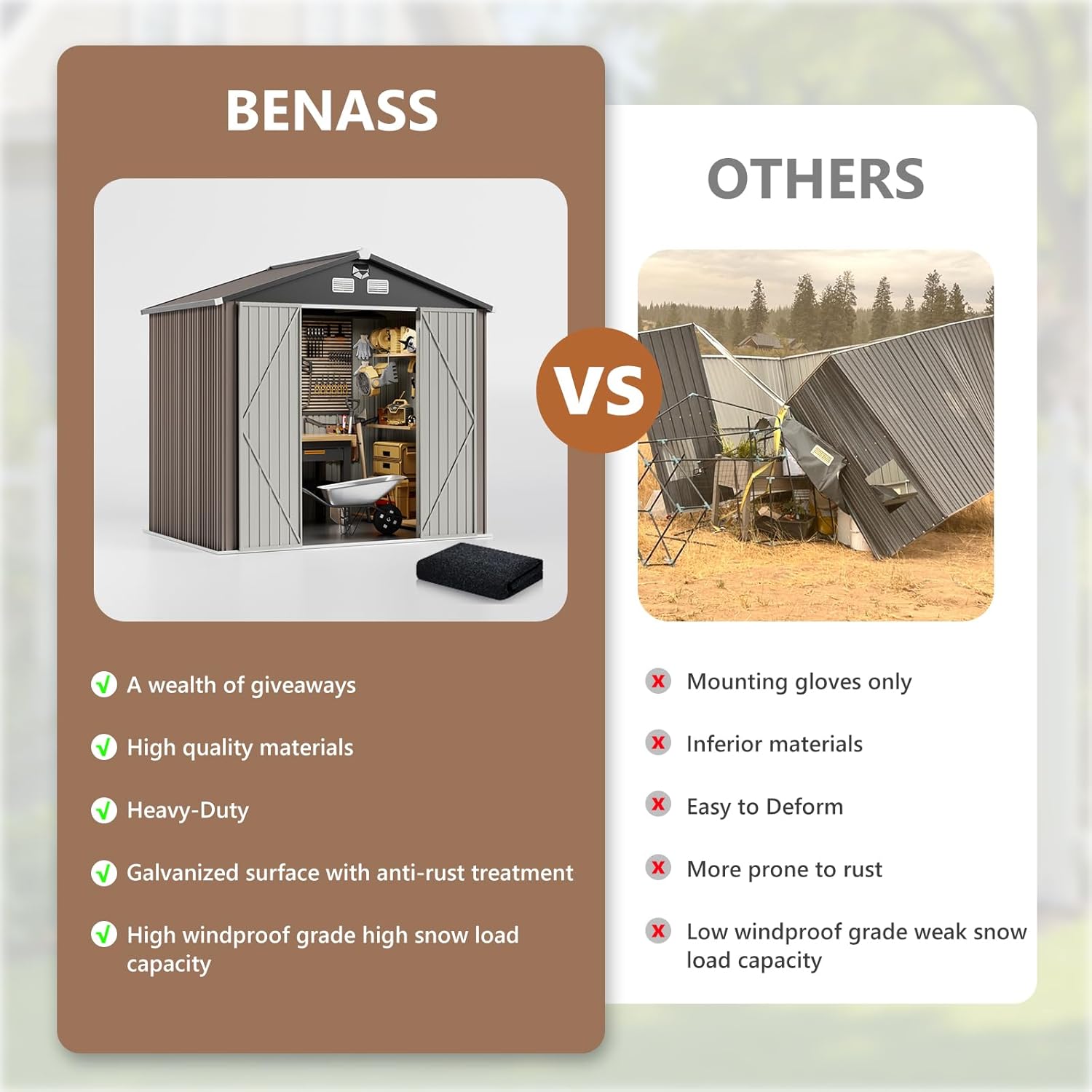 - 【Outdoor Storage Shed】Our tool shed is made of thickened galvanised steel not only strong and durable but also provides excellent protection against rust; with the reinforced frame, it can easily cope with all kinds of harsh weather and has a long service life. Note: Maximum Wind Rating: 6 (24-30mph); Maximum Allowable Snow Thickness: 6 inches.