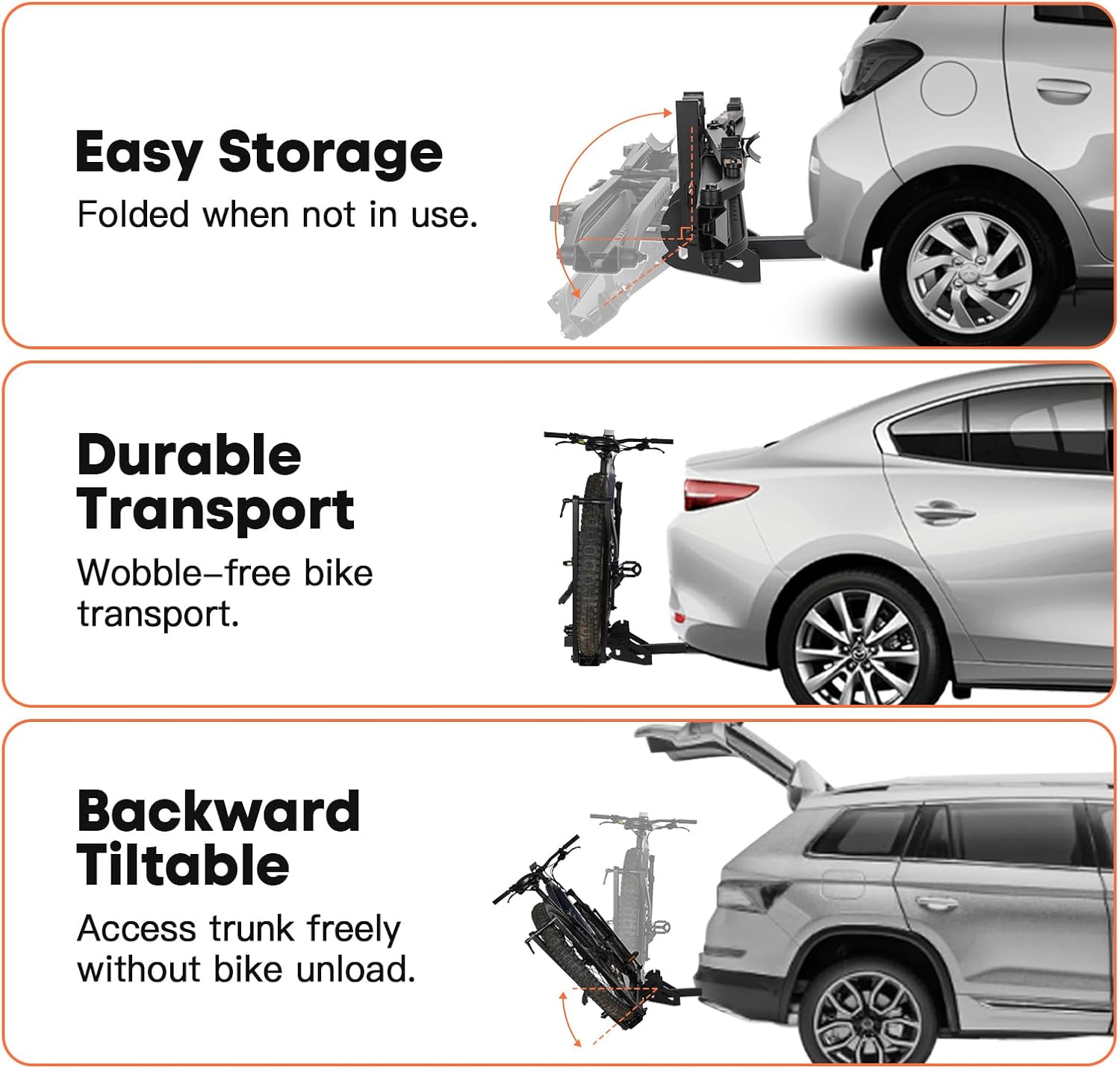 - 3-Position Adjustable: Easily fold the bike rack into three positions by pressing the handle. When not in use, you can lift it upward. For easy access to your trunk, it can be lowered to the back, or laid flat when loading your bike.