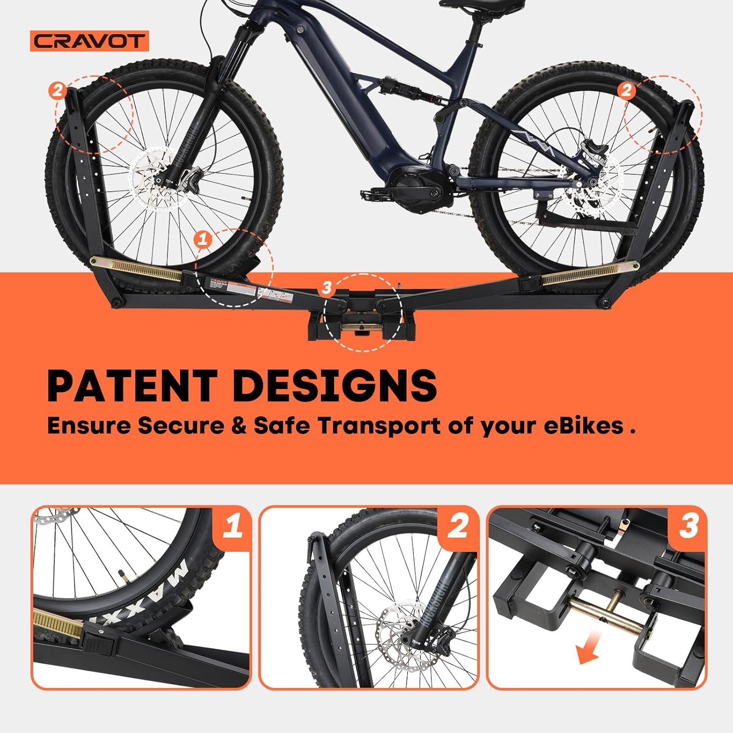 - 100 lbs Capacity: CRAVOT Heavy-Duty Electric Bike Rack supports up to 100 lbs, designed to fit any vehicle with a 2-inch receiver. It accommodates electric bikes with a maximum tire width of 3.5 inches and a wheelbase up to 52 inches.