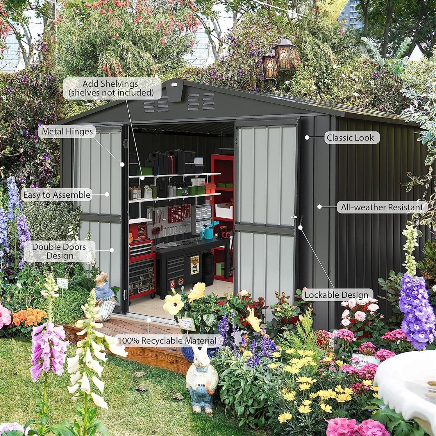 - Spacious & Organized Storage Capacity This shed provides ample space for lawnmowers, bicycles, patio furniture, and more. The intelligently designed interior accommodates shelves or hooks (not included), while wide double doors ensure easy access for bulky items. Say goodbye to cluttered garages and hello to a neatly organized backyard