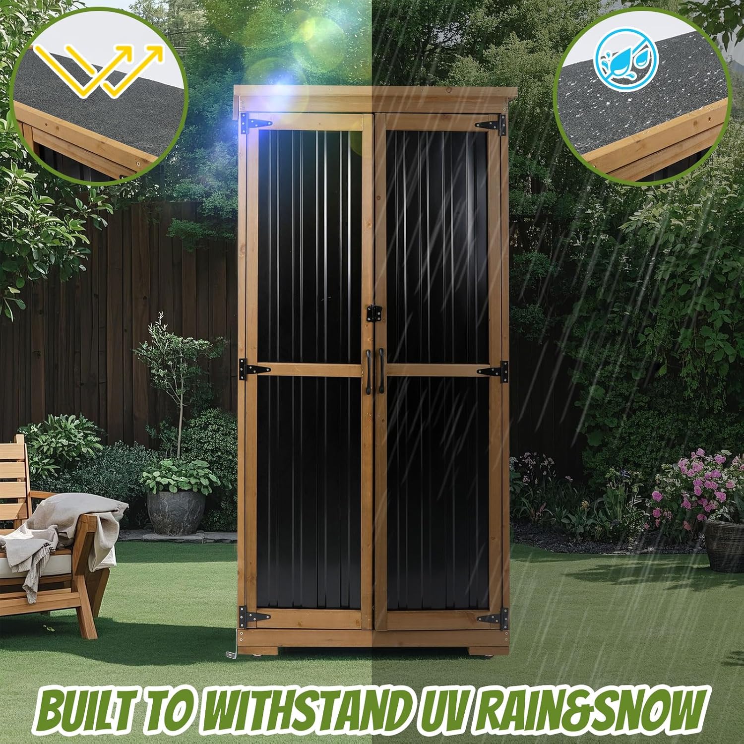 - Outdoor Storage Cabinet Built to Last-Crafted with a durable fir wood framework and rust-resistant metal panels, this cabinet combines natural strength with modern design. It's engineered to survive rain, sun, and wind while keeping your tools, gear, and essentials safe for years.
