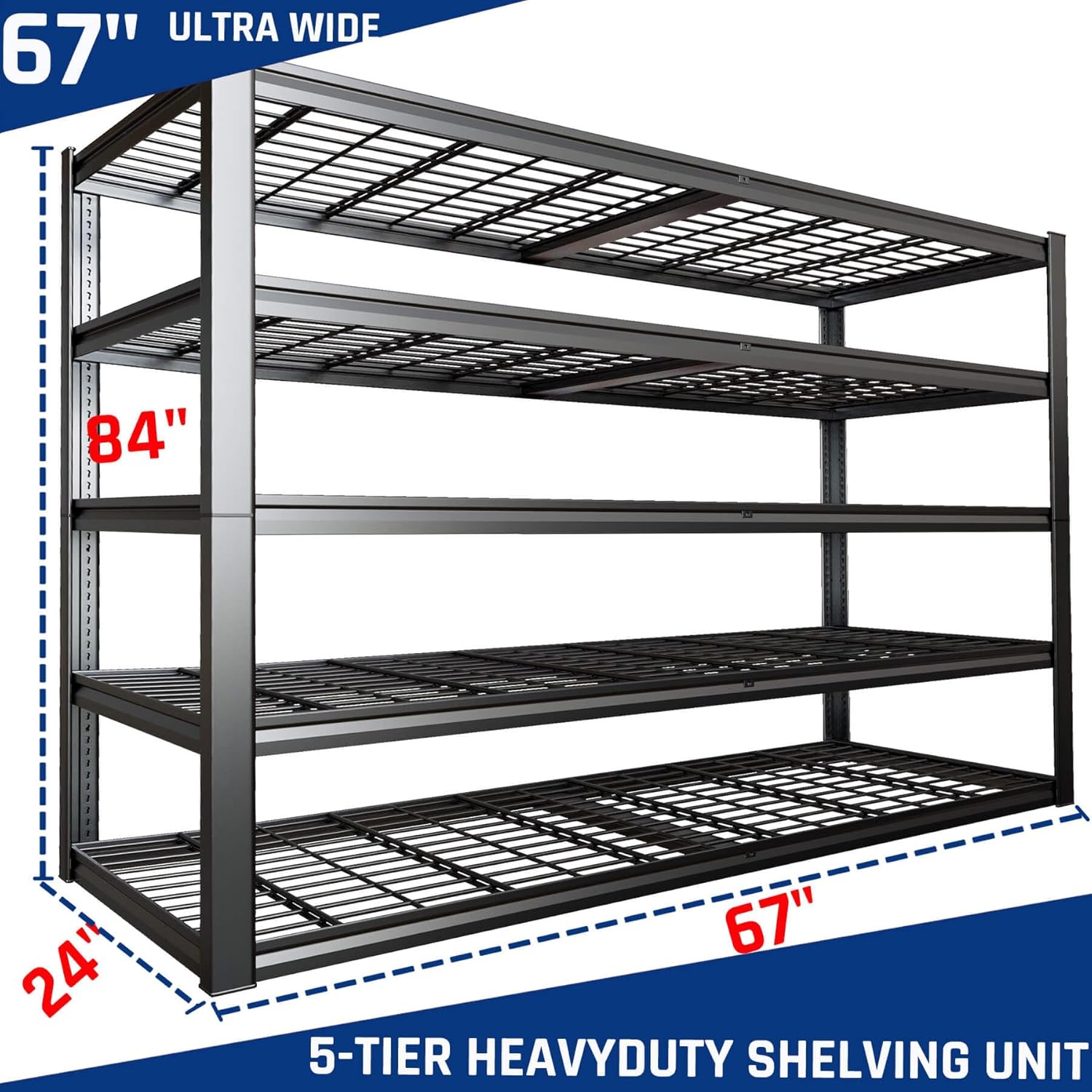 - 【Perfect for Multi-Scenario Storage】Ideal for garage shelving, workshop storage, or commercial shelving needs, this 67-inch-wide unit effortlessly organizes automotive parts, power tools, bulk supplies, or seasonal gear. Its double-layer wire decks and adjustable 5-tier design adapt to garages, warehouses, basement or shop shelves, while the 650 lbs/shelf capacity and wobble-free structure ensure safe, space-saving storage for heavy or oversized items.