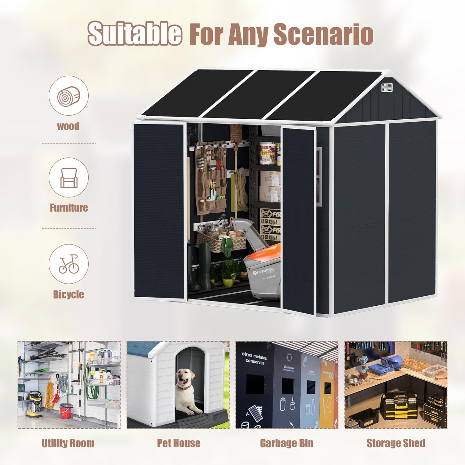 - 【Spacious Interior – Organize Freely & Efficiently】 This 8x7 ft shed offers a generous interior layout perfect for storing gardening tools, outdoor furniture, seasonal gear, and more. Whether used as a tool house, hobby workspace, or equipment storage, its open floor plan adapts to your needs with flexible storage solutions.