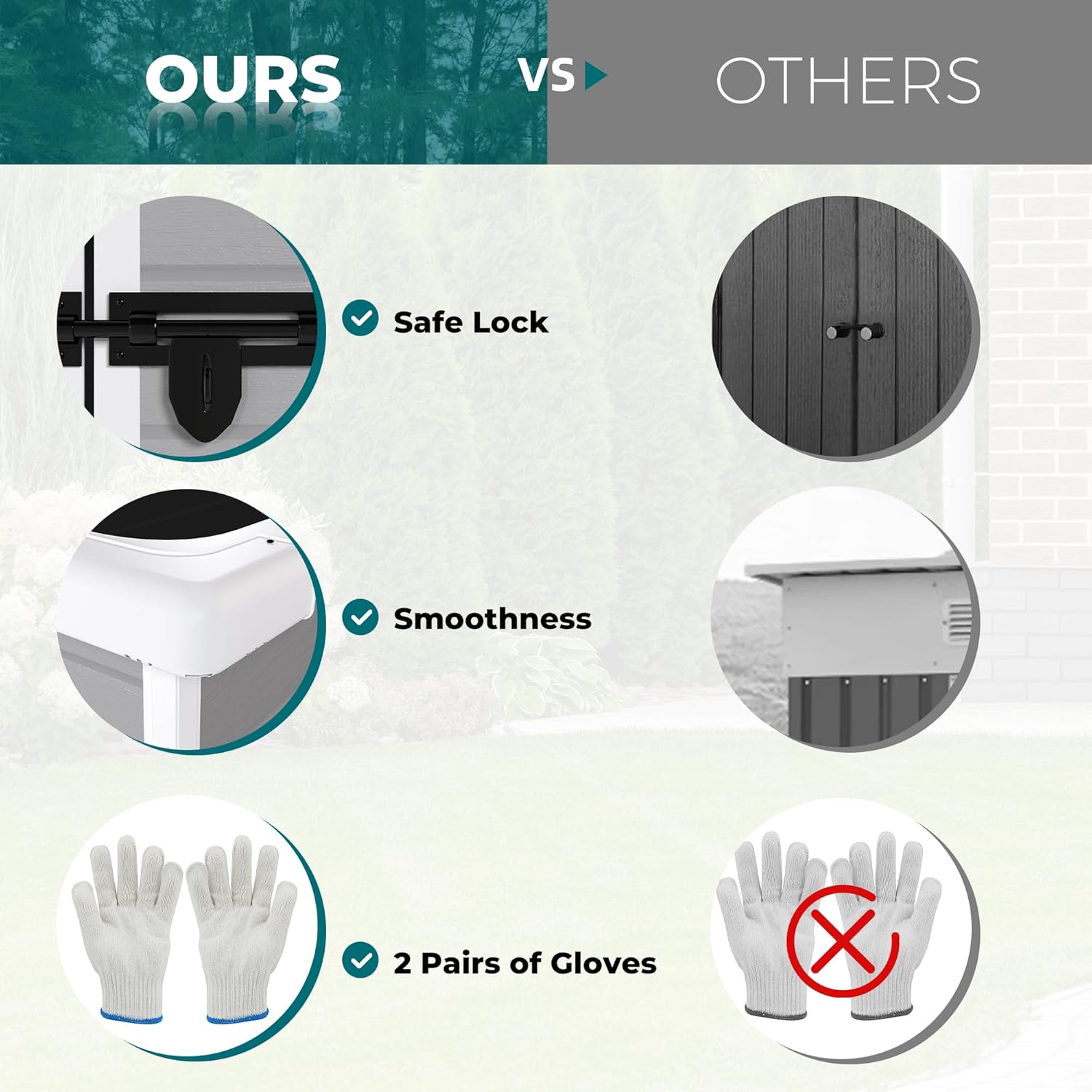 - 【12mm Thickened Premium PP Panels – Built to Last】 Crafted from high-quality polypropylene, this outdoor shed features ultra-durable 12mm thick panels—significantly stronger than typical plastic sheds. With superior pressure resistance and impact protection, it stands firm against wind, rain, and accidental collisions for long-term outdoor use.