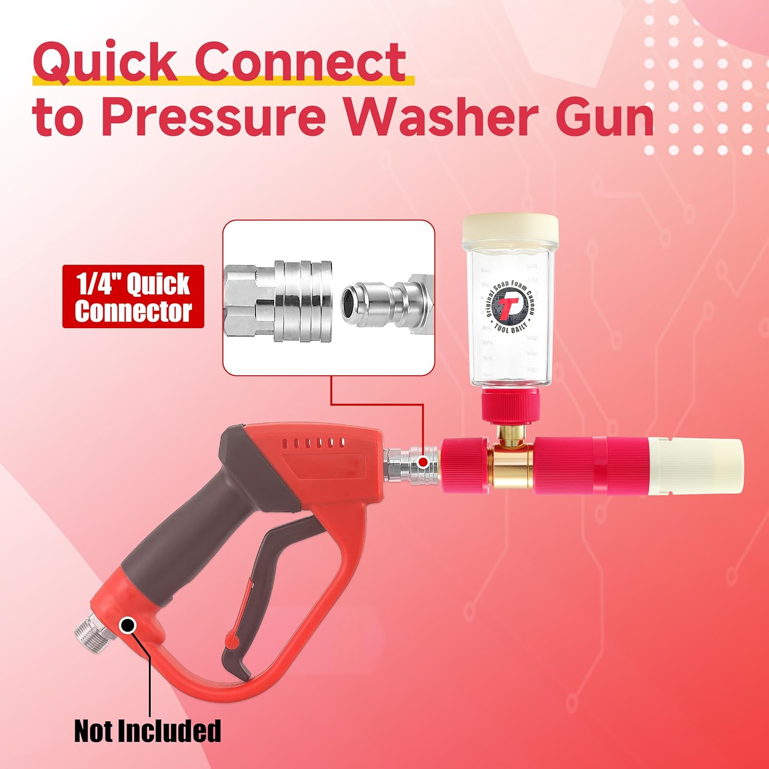 - EASY TO USE: Equipped with a 1/4” quick connector, the power washer foam cannon easily attaches to pressure washer guns or wands for quick setup. Before use, ensure the bottle is upright to allow the soap to flow properly
