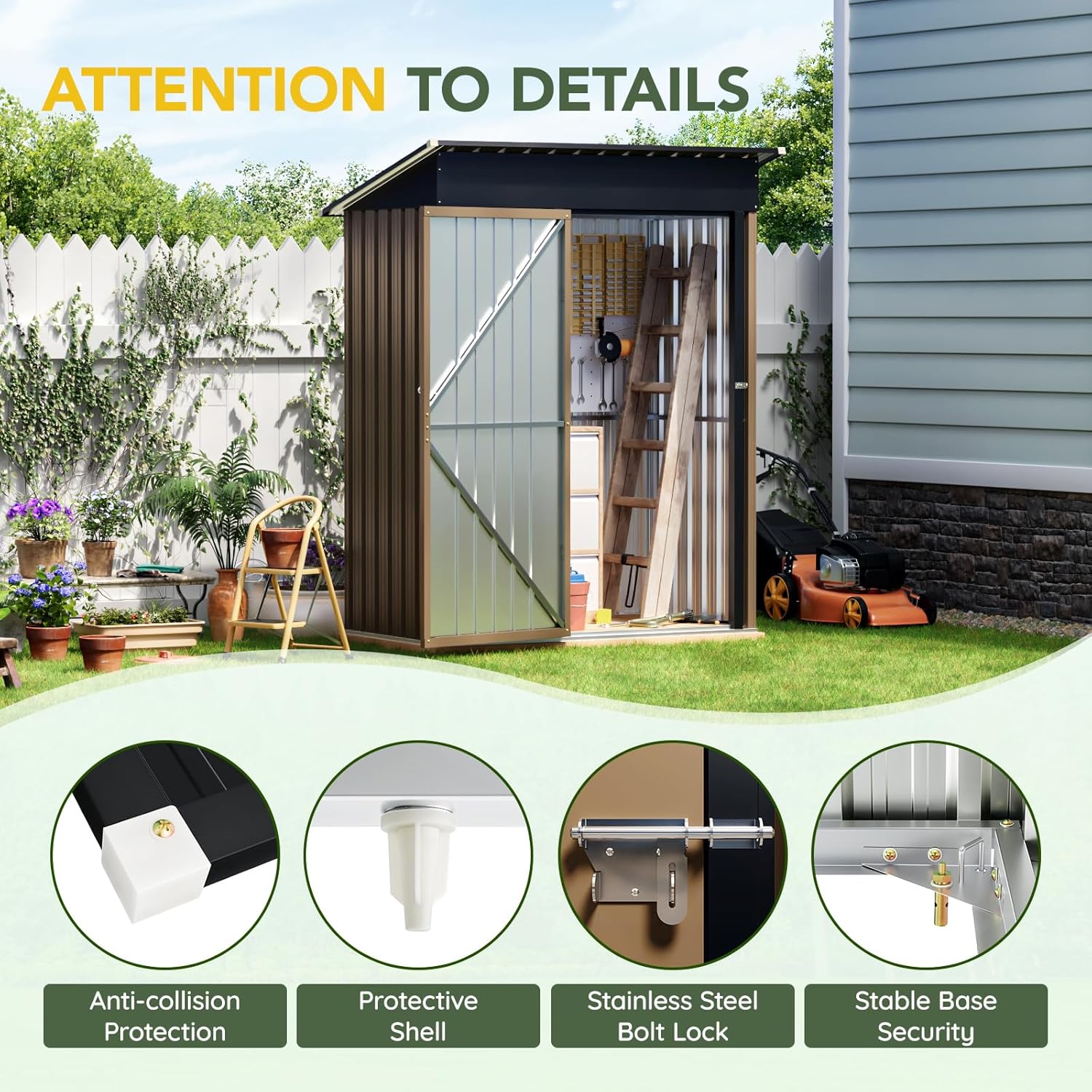Breezz 5x3FT Vertical Outdoor Steel Storage Shed with Floor Frame, Lockable Doors, Compact Metal Tool Shed for Garden, Backyard, Patio, Utility, and Bike Storage,Brown