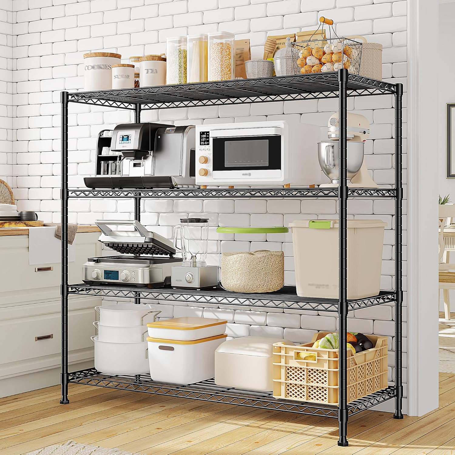 - Adjustable Wire Shelf organizer Heights for Flexible Storage:The height of each tier on this adjustable metal shelving unit can be customized to fit items of any size. Locking clips keep shelves firmly in place—perfect for tall kitchen appliances, pantry goods, or storage bins.