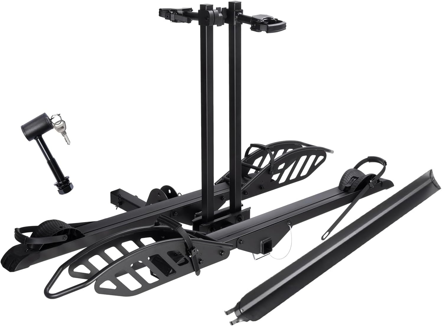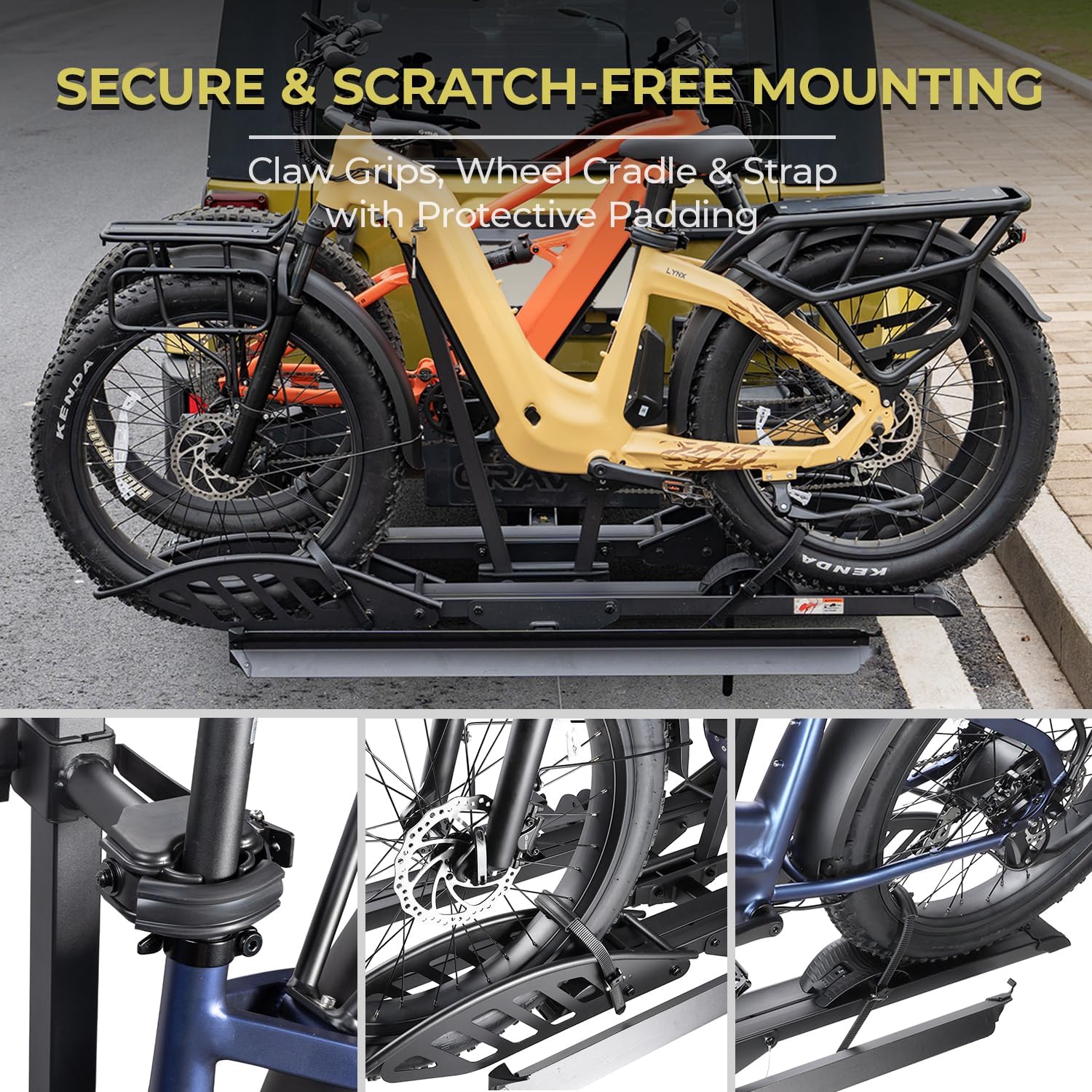 - Anti-Wobble Stability & Frame Protection: The advanced anti-wobble system with a V-shaped cradle, torque-tightened center rod, and shock-absorbing bolts ensures solid stability on highways and rough terrain. Combined with soft rubber padding, it protects your bike’s frame and paint during every ride. The hitch lock adds another layer of security on the road