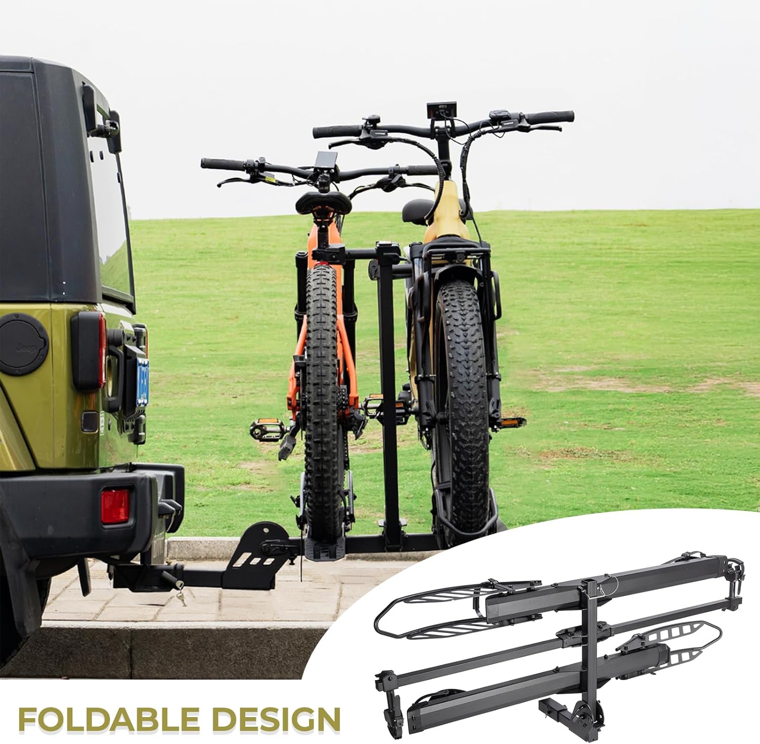 - Heavy-Duty ebike rack – 200lbs Capacity: This ebike rack supports 2 bikes up to 100lbs each, perfect for fat tire bikes and electric bikes. Compatible with any 2-inch hitch receiver, it fits most vehicles including SUVs, trucks, and RVs. Tire widths up to 5” and wheelbases up to 50” are supported, making it an ideal bike rack for car and bike rack for SUV