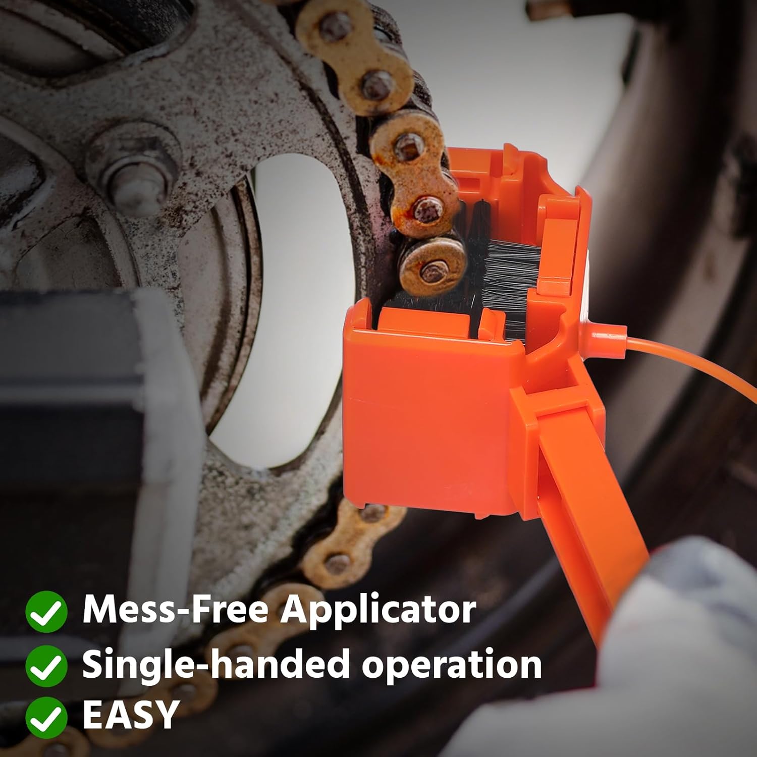 - No Spill Lube Tool: the motorcycle chain lube tool ensures your oiler work seamlessly even lubrication without splatter; Its protective guard prevents over-spray, keeping your bike clean while reducing friction and rust