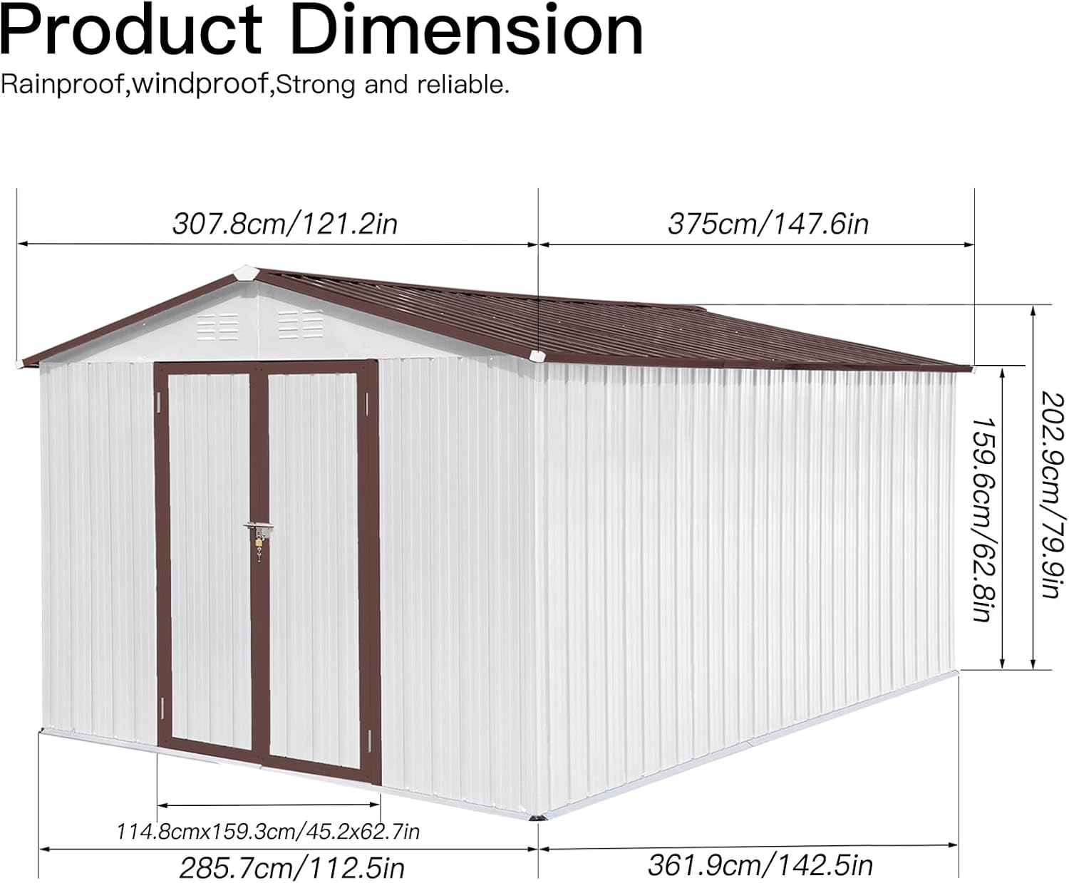 12 x 10 FT Metal Garden Shed, Outdoor Storage Shed with Heavy-Duty Steel Construction, Built-in Punched Vents & Hinged Door, Free Padlock for Secure Backyard, Patio & Garage Storage, White + Coffee