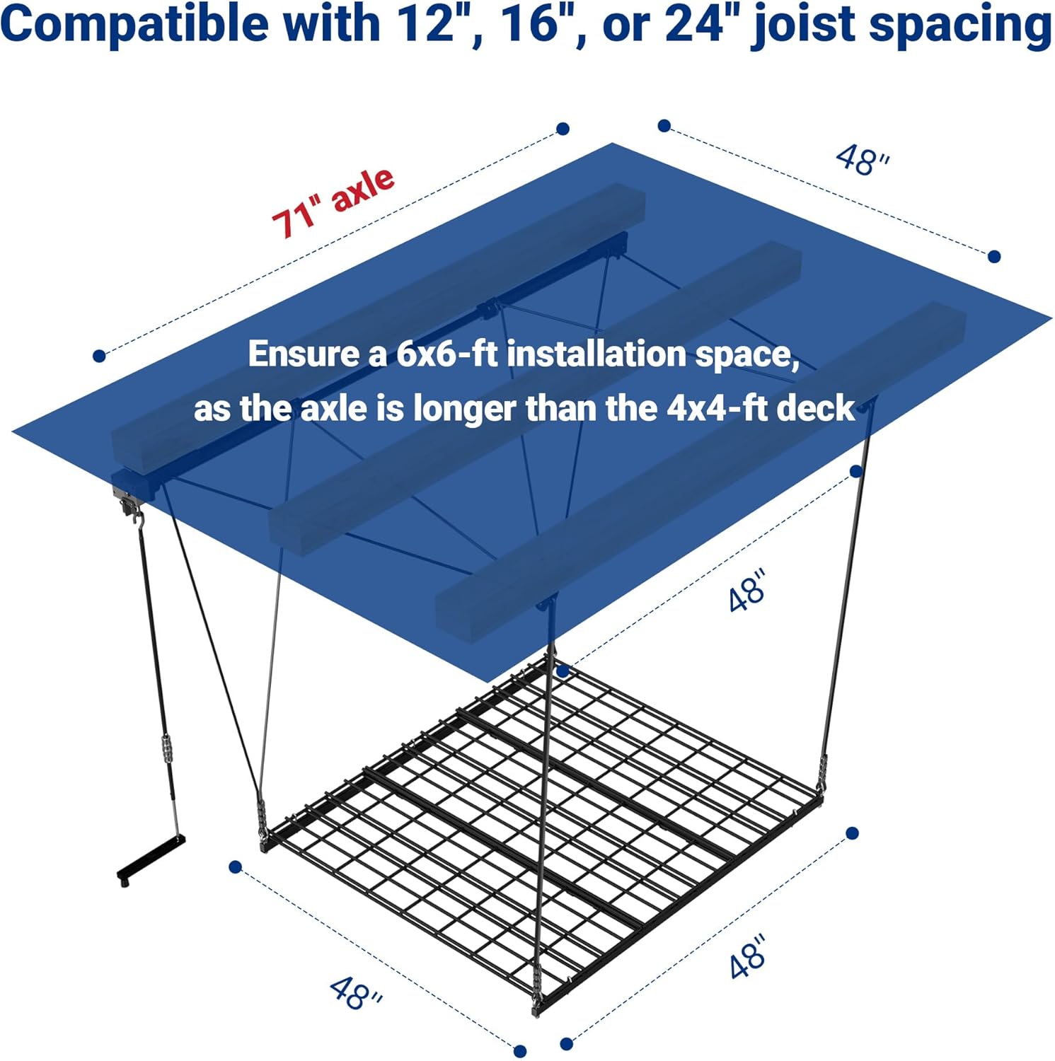 - Note: The 71-inch axle length exceeds the dimensions of the 4'x4' deck. Please ensure a 6x6-ft installation space. This rack is compatible with 12-inch, 16-inch, or 24-inch ceiling joist spacing (Note: not suitable for 18-inch joist spacing). The highest point of the wire deck is approximately 10 inches below the ceiling.