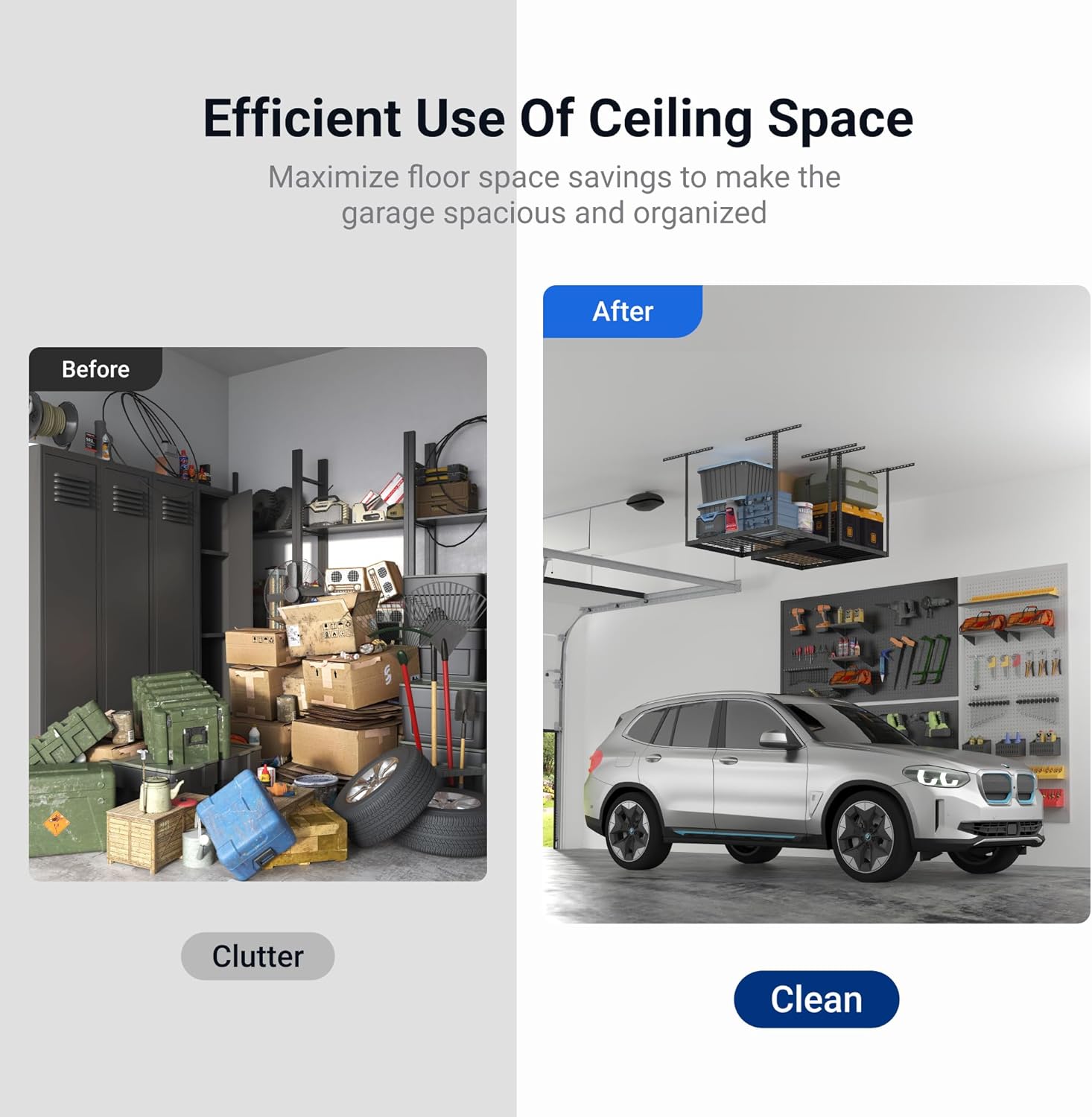 - Free Up Floor Space: Avoid water damage by storing your items off the garage floor and utilize the garage ceiling space to protect and store seasonal and unused items. Unlike traditional floor storage bins, this ceiling rack features a grid design that allows for easy access to your belongings. The adjustable ceiling dropdown ranges from 22" to 40", providing up to 20 cu. ft. of storage. Dimensions: 36 in. L x 24 in. W x 22-40 in. H. (Hooks sold separately)