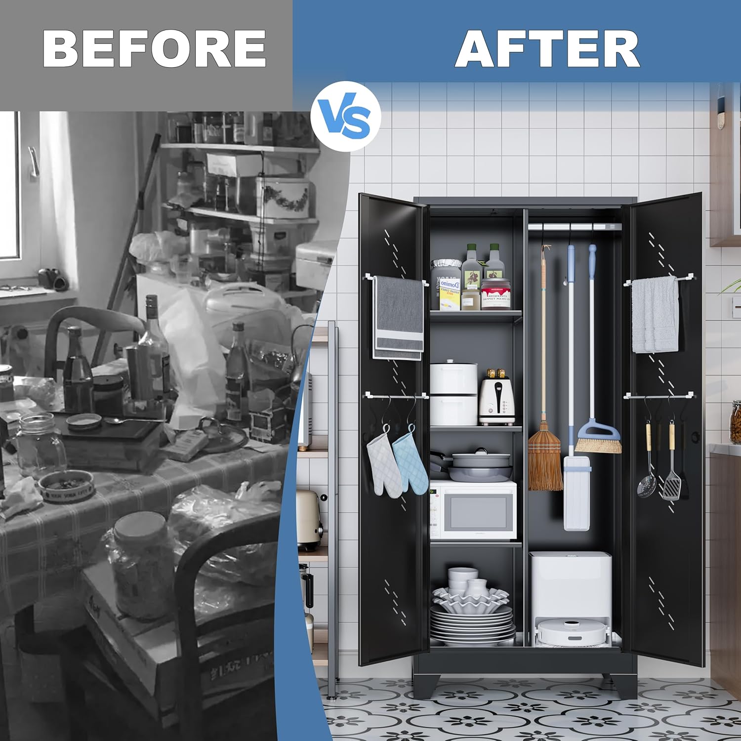 Metal Garage Storage Cabinet with Locking Doors, 71" Tall Broom Closet Storage Cabinet, Heavy Duty Garage Organization Cabinets, Steel Cabinet with Hanging Rod, Assembly Required