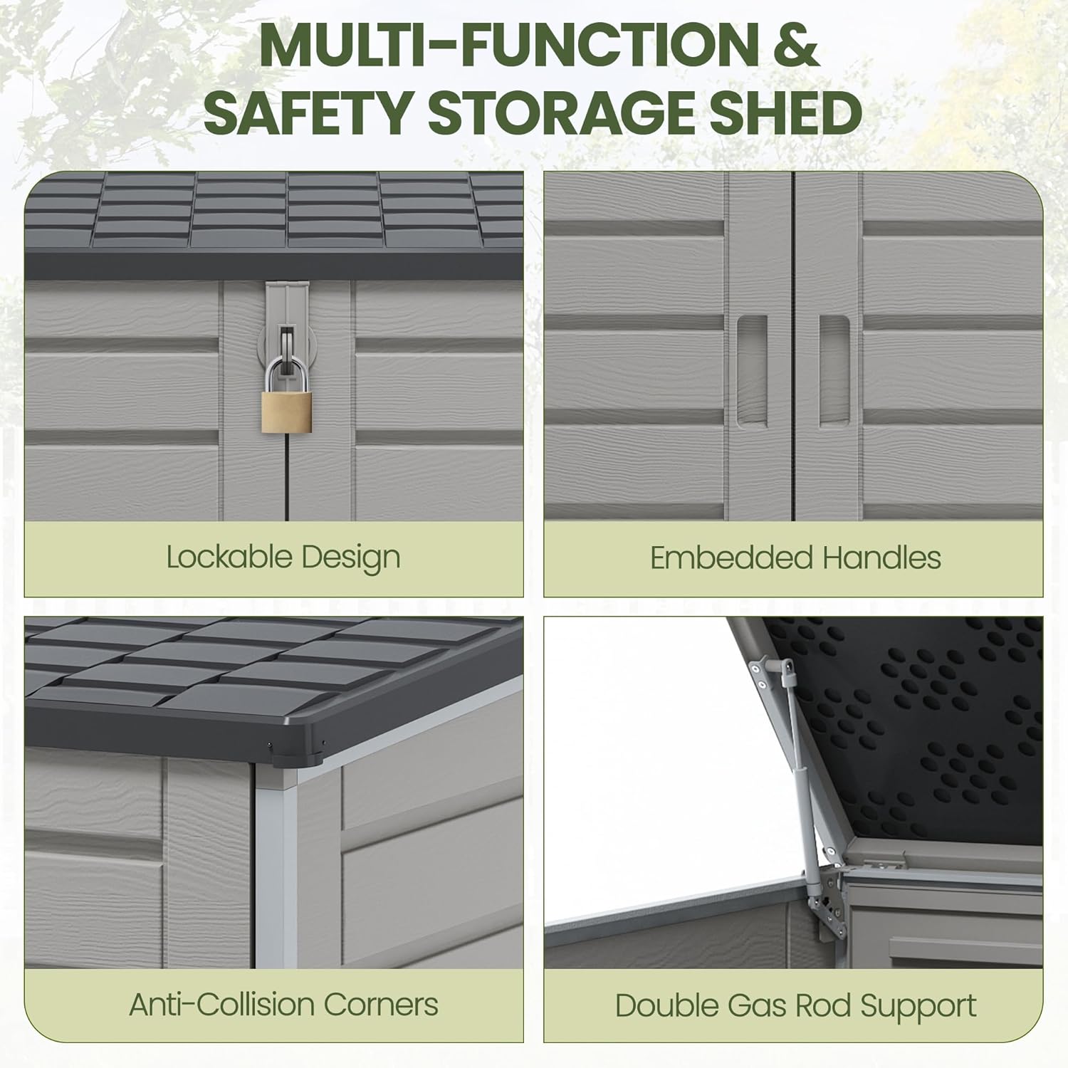 - Weather-Resistant Outdoor Design: This Weather-resistant outdoor storage shed features a sloped roof that effectively drains rainwater, preventing water buildup and keeping the interior dry. The dual hydraulic pistons allow the lid to open smoothly and stay securely in place without sudden drops. Reinforced double doors with lockable design enhance security, making this garden storage cabinet a durable and reliable solution for backyard and patio organization