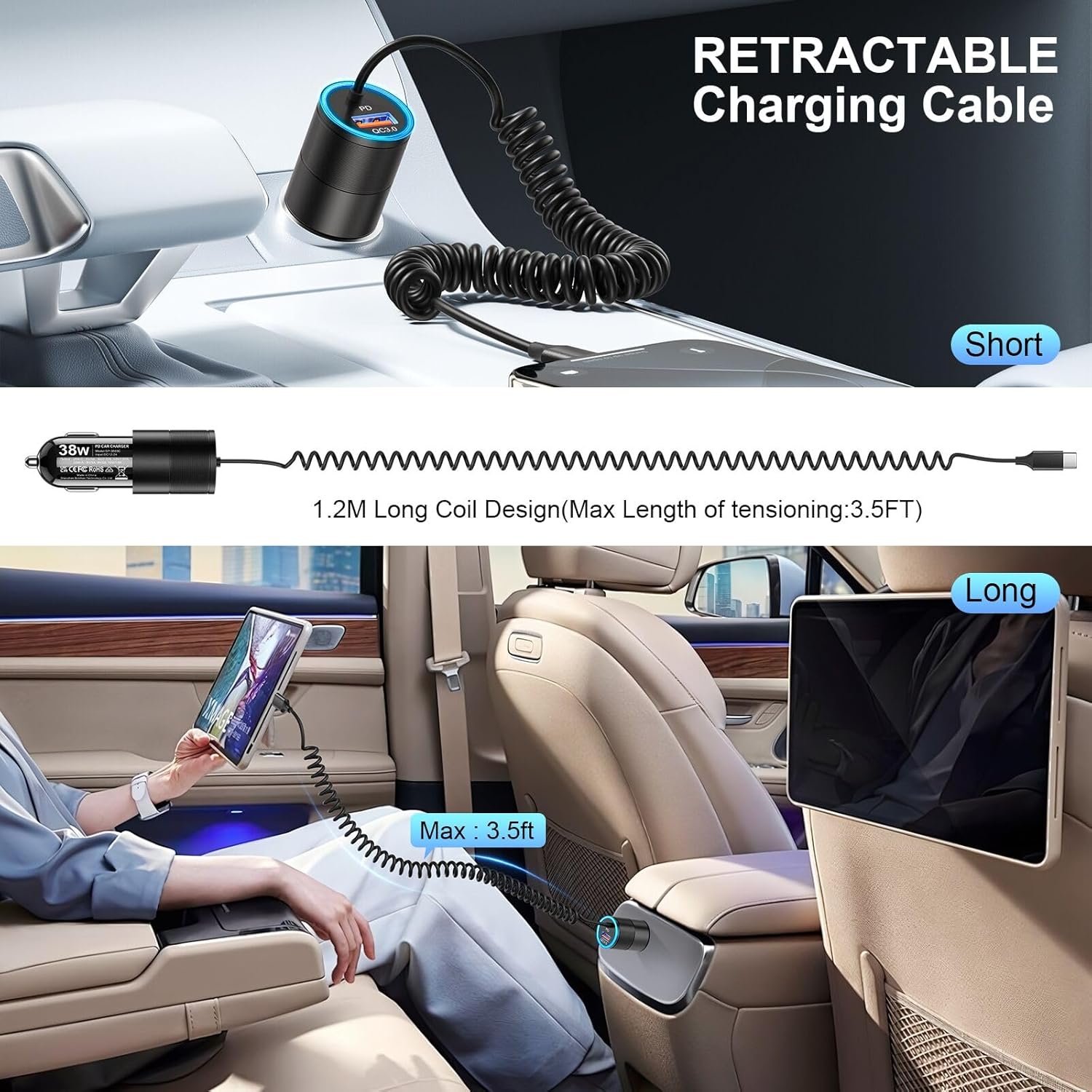 - [3.5FT Retractable Coiled Cable] Car Charger Adapter with retractable 3.5FT Built-in fast charge coiled cable.Even if you forget to bring charging cable, the built-in charging cable can still charge iPhone 16/ 15 and Android devices, saving you from the predicament of your phone running out of power when traveling.Retractable cable can freely extend to a maximum length of 120 centimeters (3.94 feet), and it has a fast rebound speed to prevent messy charging cables from entangling the gear lever.