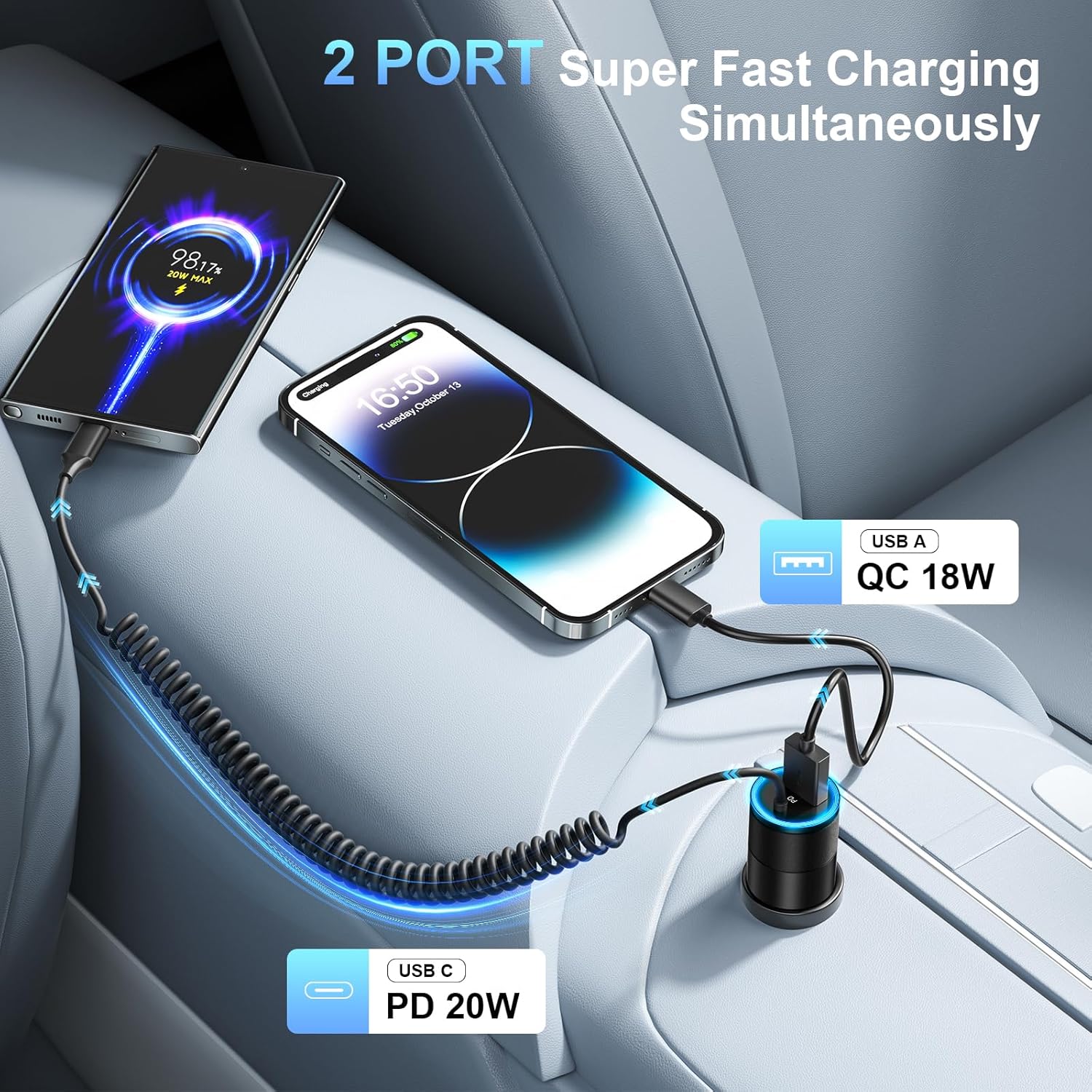 - [Super Charge On The Road] USB C car charger fast charging has both a USB A(QC 3.0-18W) port and a TYPE C(PD 3.0-20W) coiled cable.The cable enables iPhone 16 to charge from 0 to 60% within 30 minutes. When you use both the USB A port and the USB C cable simultaneously, it can also meet the fast charging requirements of two devices.