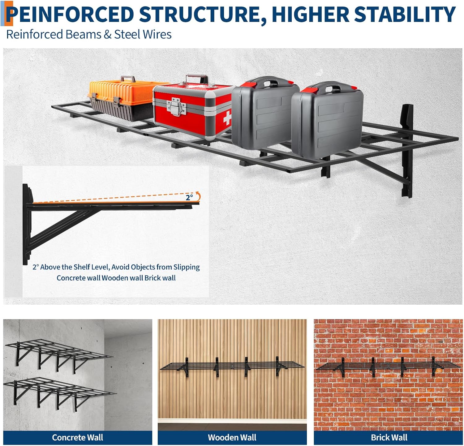 Garage Storage Shelving Wall Mounted, 2 Pack 2x6Ft, Loads 1600 Lbs Heavy Duty Sturdy Shelves, Folding Strong Garage Organiser, Storage Racks Units, Black Metal Floating Adjustable Wall System Shelf