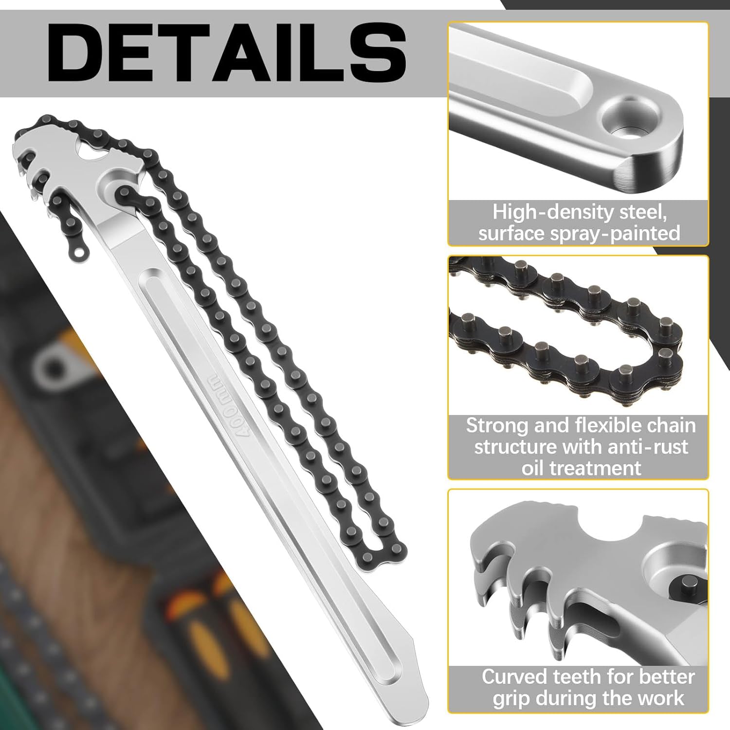 - Effortless Usage: say goodbye to complicated processes and tools; Our oil filter strap wrenches have been designed with an easily adjustable chain that suits different diameters of oil filters or pipes; Just fasten the chain to your desired diameter and carry with your operations; Save time and energy with our friendly design