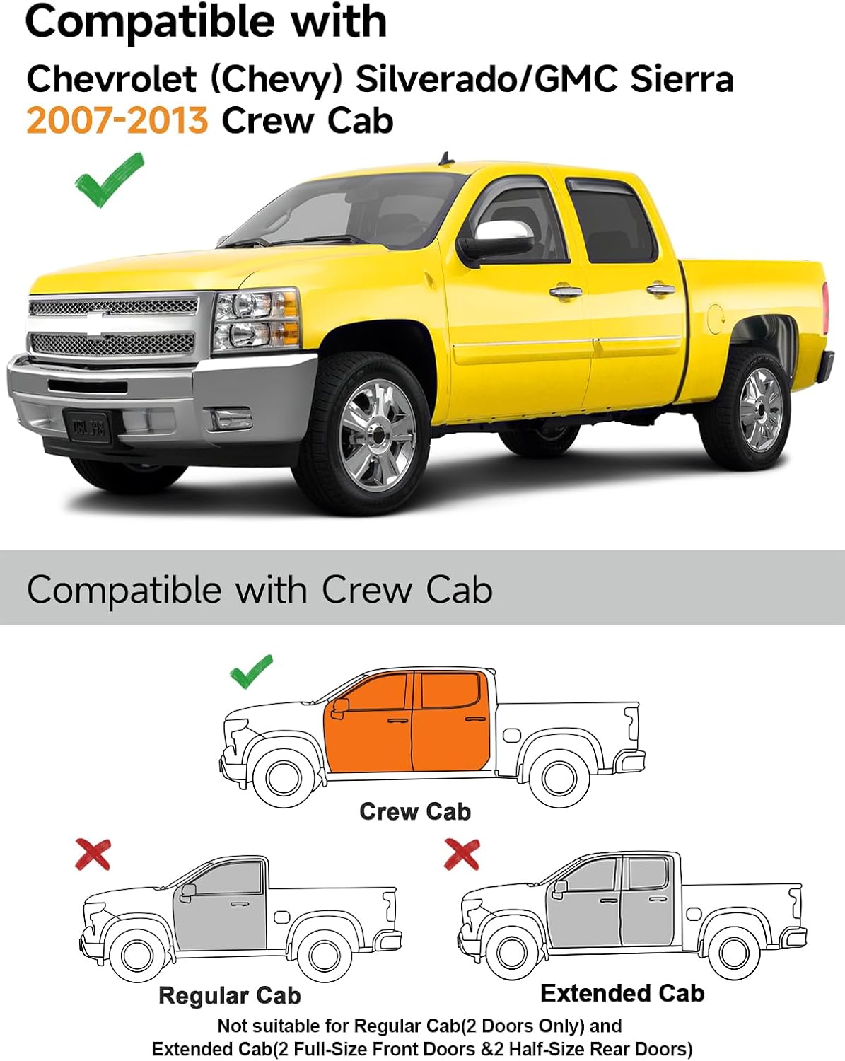 - 【Compatibility】The Deejecsun Window Rain Guards weather tech suitable for Truck Chevrolet (Chevy) Silverado/GMC Sierra Crew Cab 2007 2008 2009 2010 2011 2012 2013 Warning:Not suitable for Regular Cab(2 Doors Only) and Extended Cab(2 Full-Size Front Doors &2 Half-Size Rear Doors)