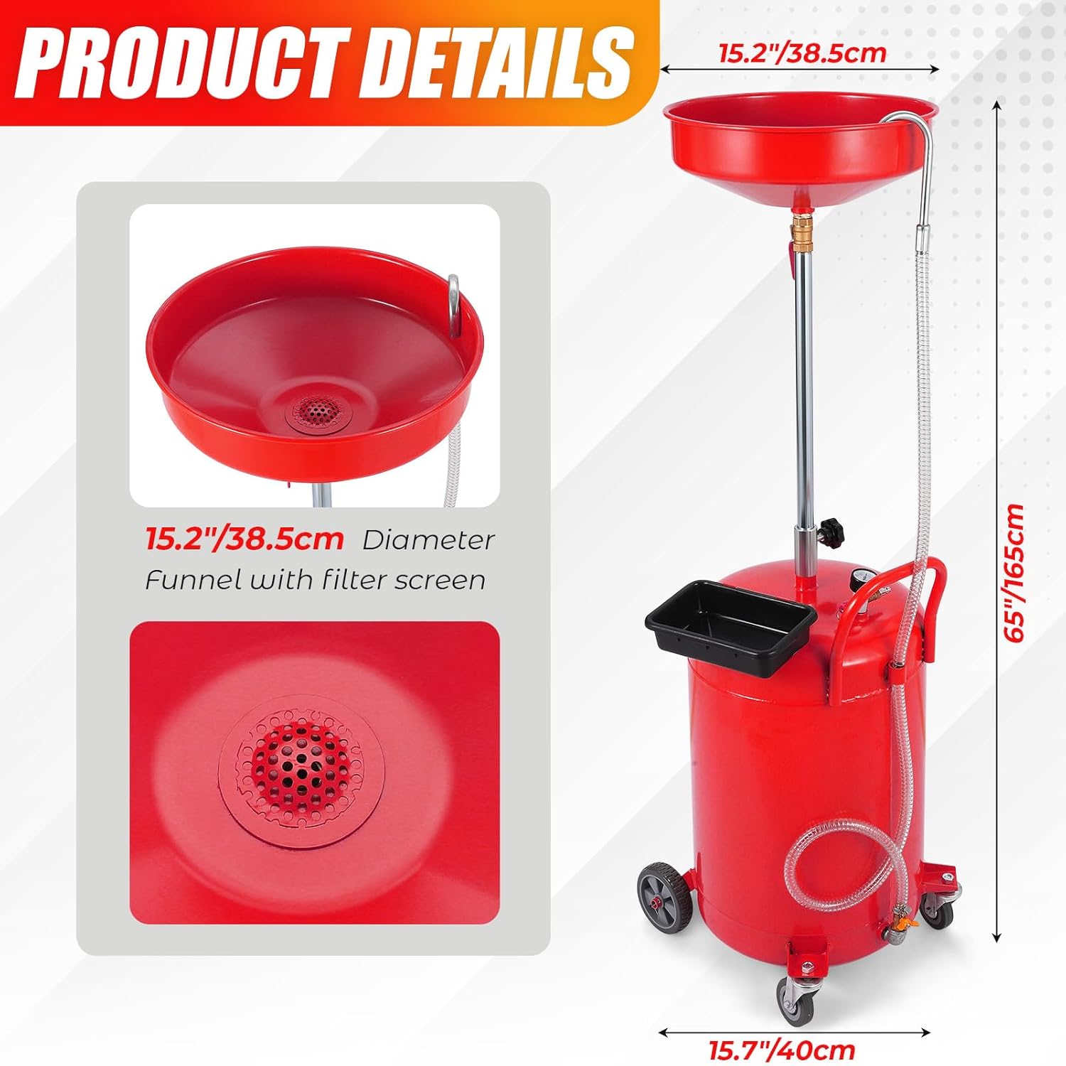 20 Gallon Waste Oil Drain Tank Portable Air Operated Oil Drainer with Adjustable Funnel Height 38-65 Inches 15 Inch Funnel Fluid Fuel Transfer Drain Container with 360 Degree Wheels and Toolbox Red
