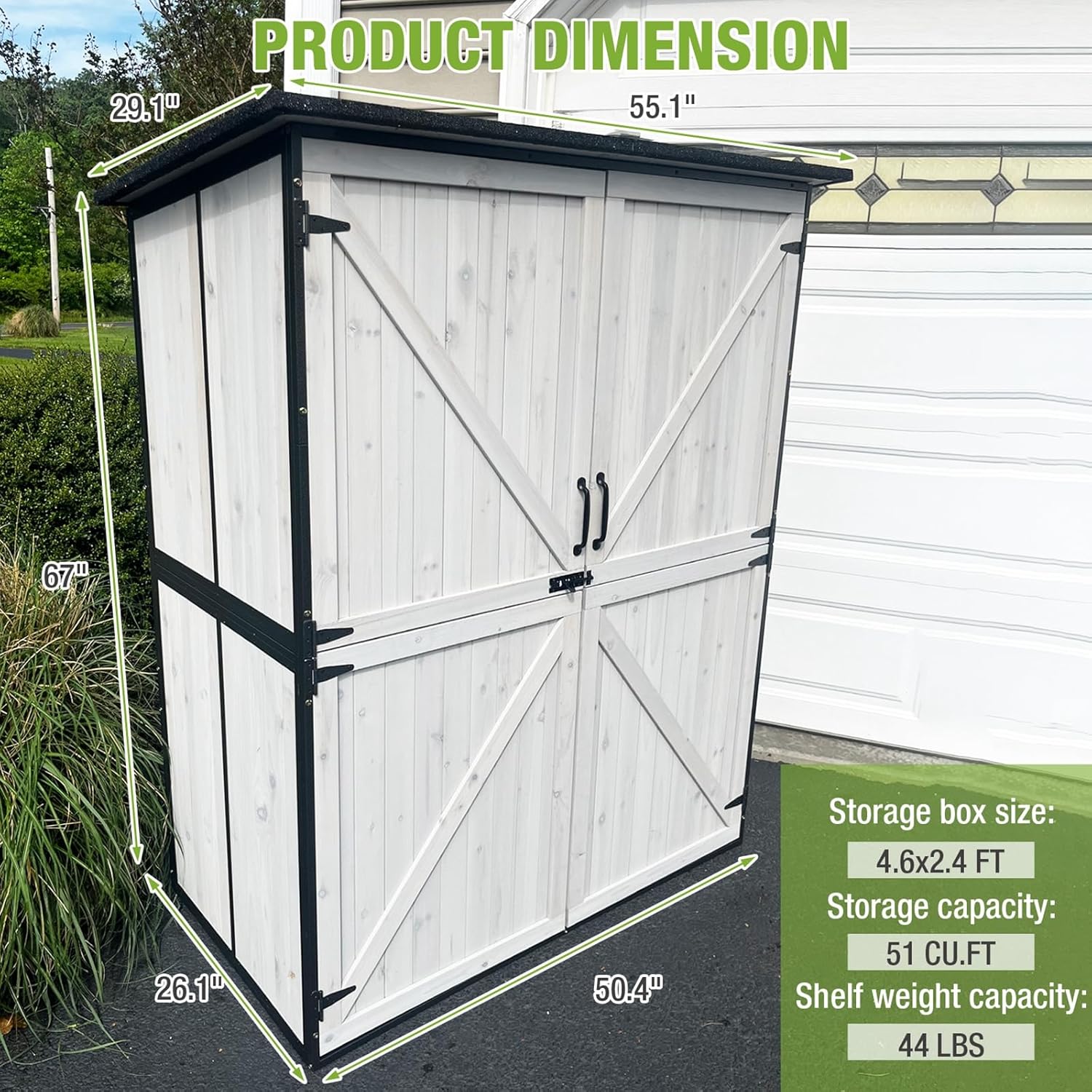 - 【Large Storage Space】Overall dimension:29"D x 55"W x 67"H.Ideal for storing bikes,toy cars,gardening tools and sports equipment,the outdoor storage cabinet can be used as a tool cabinet,garden shed or pool storage.