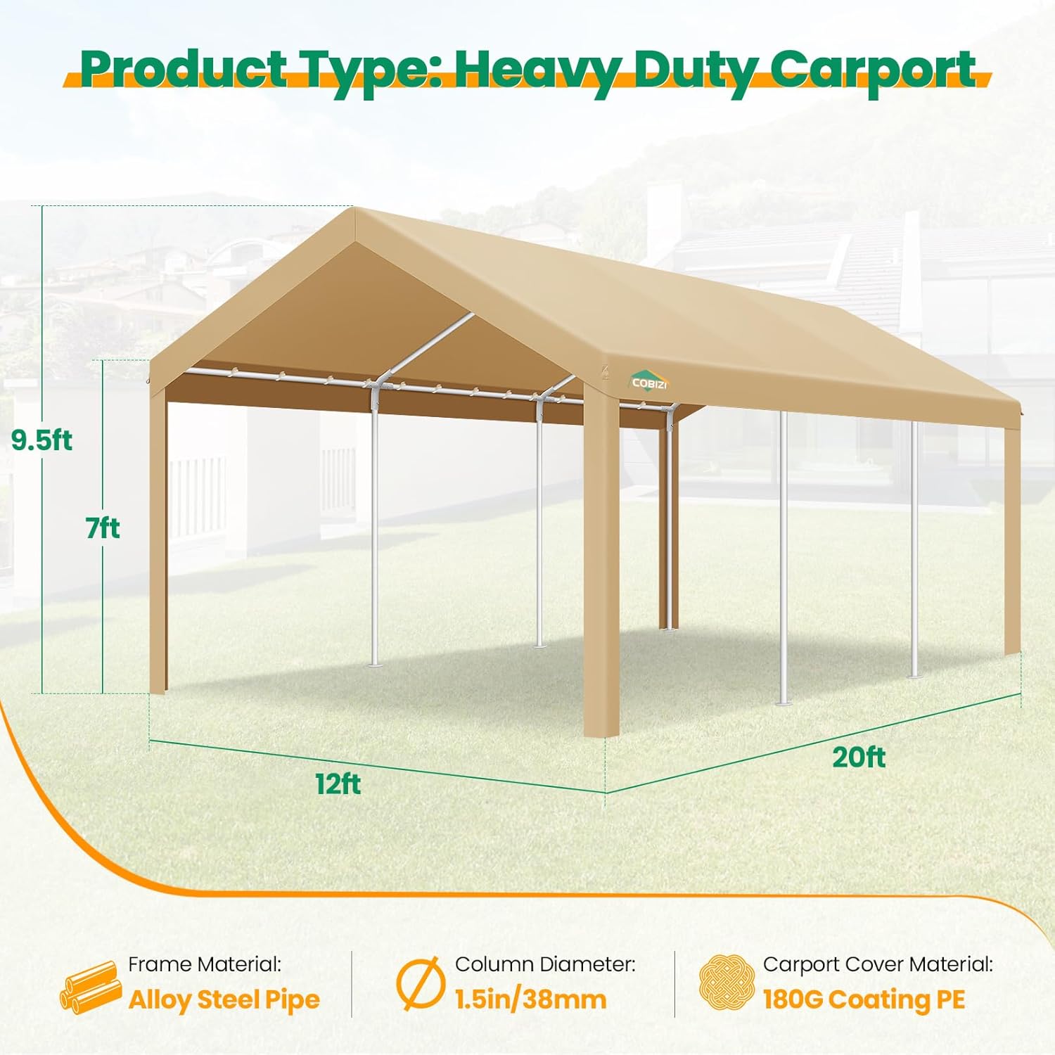 COBIZI Carport Canopy 12x20 Heavy Duty Car Tent Garage, Galvanized Frame Car Canopy Outdoor Shelter Waterproof & UV Protected with Built-in Sandbags & All-Season Tarp for Car Boat Truck, Khaki