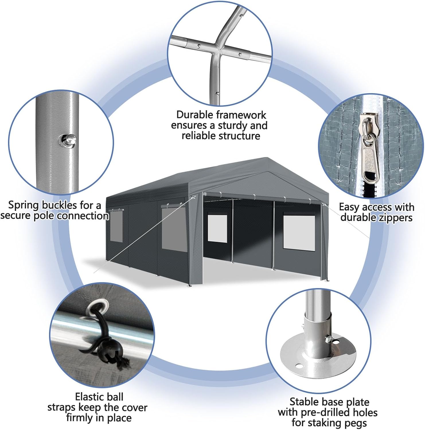 - Spacious Heavy-Duty Carport: The 12x20 car port provides ample space for your vehicles, boats, cargo, etc. Removable sidewalls and doors can meet your various needs. The carport canopy shelter is perfect for parties, commercial exhibitions, outdoor events, weddings, storage shelters, and so on