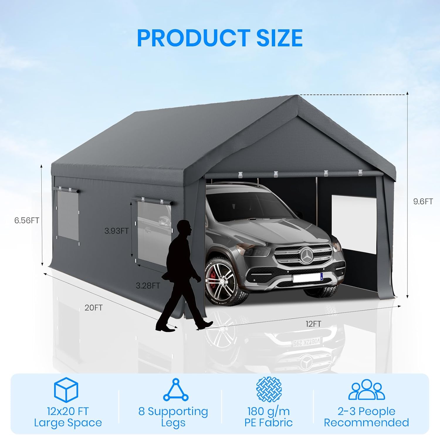 Carport 12x20 FT Heavy Duty,Outdoor Portable Garage with Removable Sidewalls & Doors, Waterproof, UV-Resistant Canopy Shelter for Vehicles, Boats, RVs, Trucks, All-Season Car Port, Gray