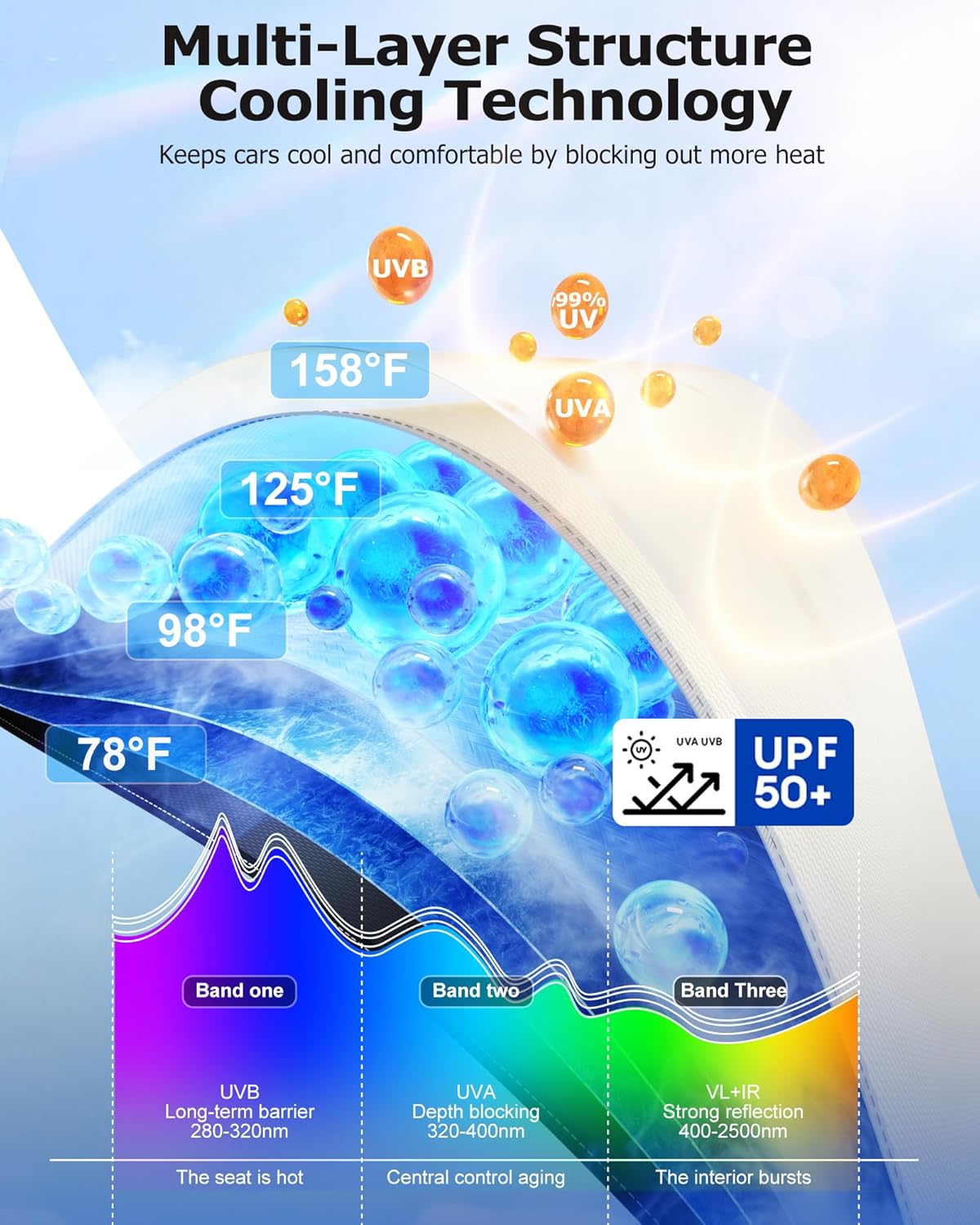 - [Superior Heat Insulation & Cooling Performance] The upgraded canopy features a new off-white cooling coating and a multi-layer composite aluminum reflective layer with UPF 50+ and ≥99% UVA/UVB blockage. Made of 240T high-density polyester, it blocks 99% of external heat, lowering cabin temperatures from over 70°C (158°F) to around 26°C (78.8°F) for a comfortably cool drive.