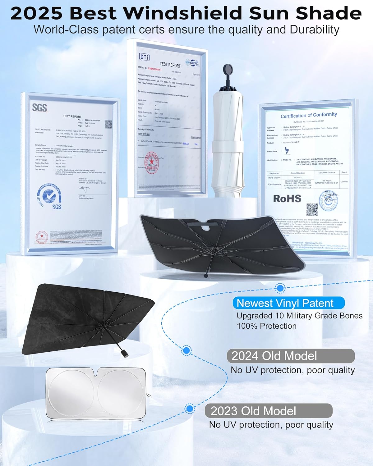 - [10-Rib Structure for Full Coverage] Featuring a tightly structured 10-rib design, this sun shade for car windshield provides approximately 30% more coverage than 8-rib models. Under intense sunlight, it reduces interior light intensity from 100,000 lux to below 500 lux, shielding your dashboard from direct sunlight and preventing interior aging.