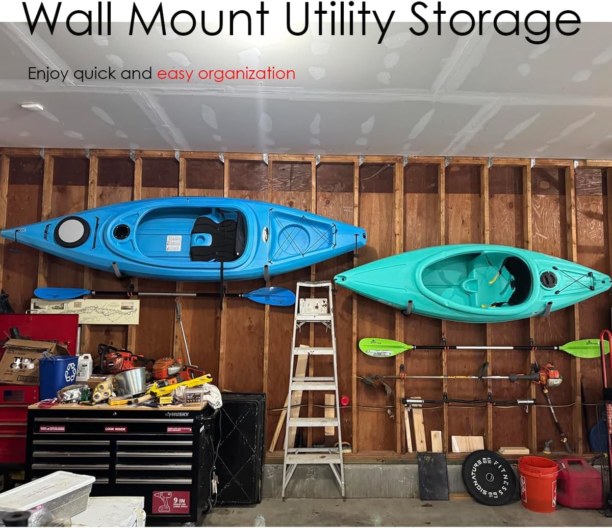 - VERSATILE STORAGE OPTIONS - Utility jumbo arm garage storage holders, ideal for garage storage organization, can be used as kayak storage hangers, paddle board holder on wall, snowboard rack and surf board rack wall mounts, heavy-duty hook for canoe, fold chairs, ladders, garden hoses, tools, bike, sport equipment and other bulky items. Organize and protect them from damage or clutter. Help you to well organize your space
