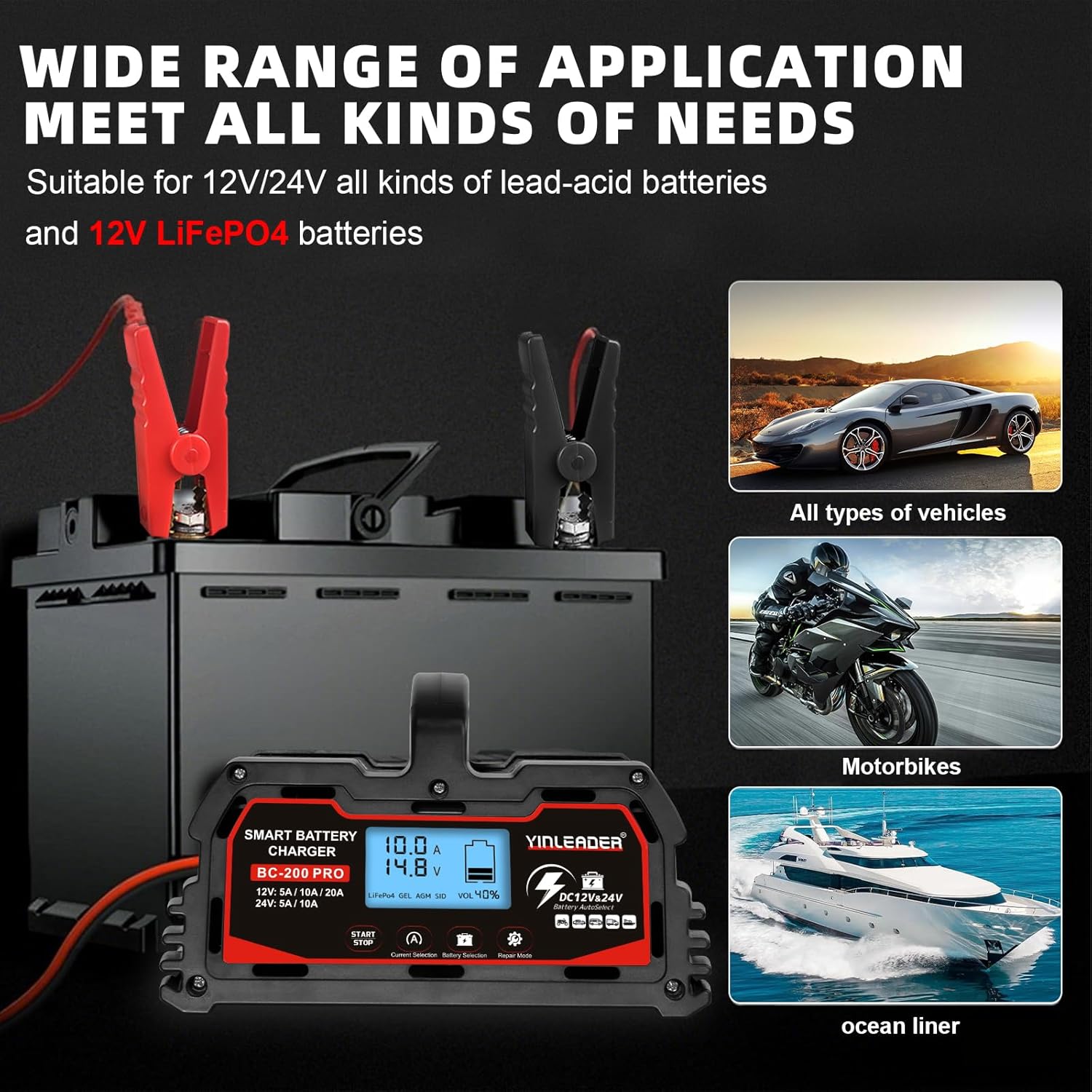 Battery Charger 20A, 12V/24V Lead Acid Smart Battery Charger, 12V LiFePO4 Car Battery Trickle Charger, Automatic Battery Maintainer for Car Motorcycle Lawn Mower Marine Boat Lead Acid Batteries