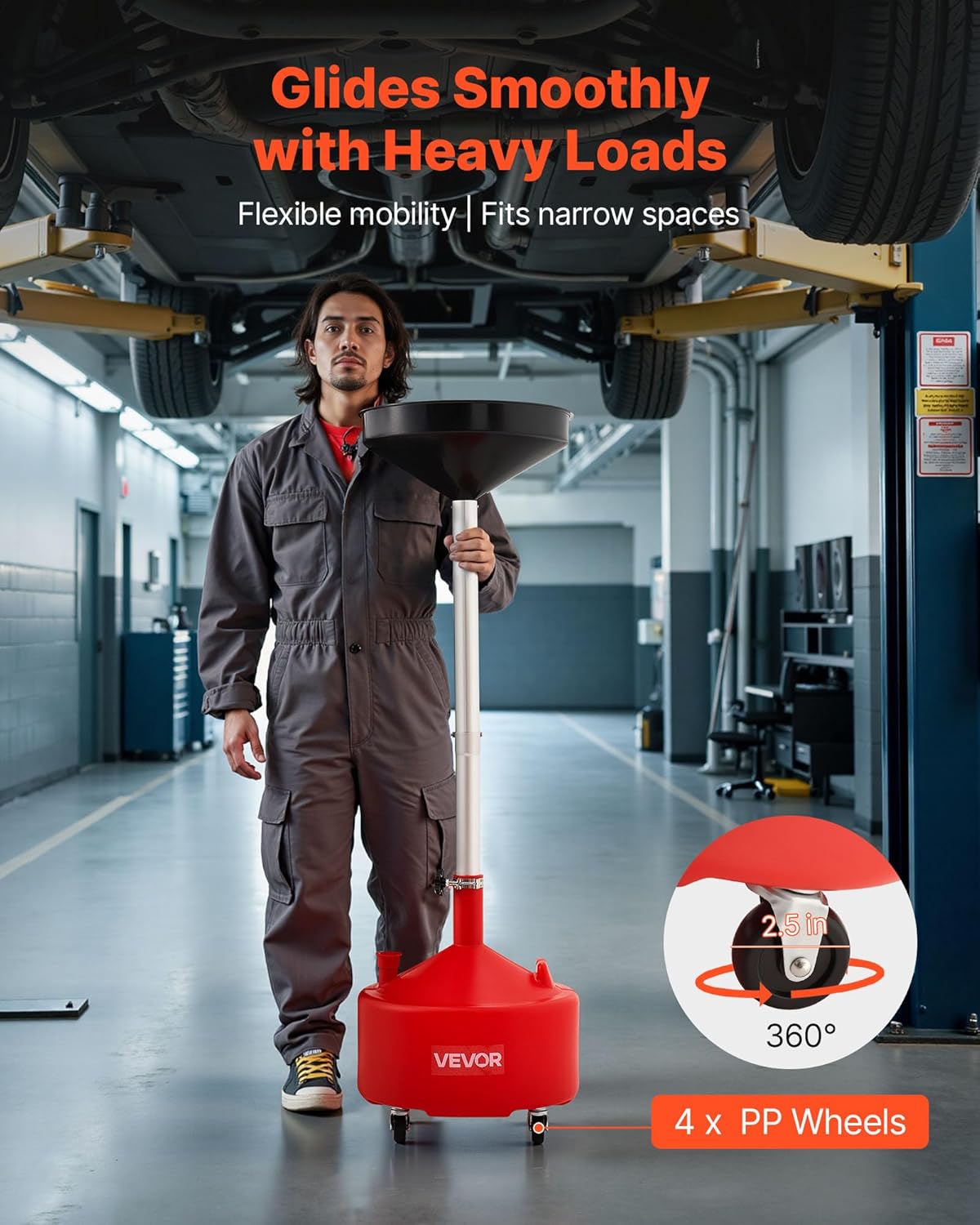 VEVOR 8 Gallon Waste Oil Drain Tank, Industrial Fluid Drain Tank with Adjustable Funnel Height, Portable Oil Drainer with Wheels, Fluid Fuel Transfer Drainage for Auto Repair Shops, Garages, Red