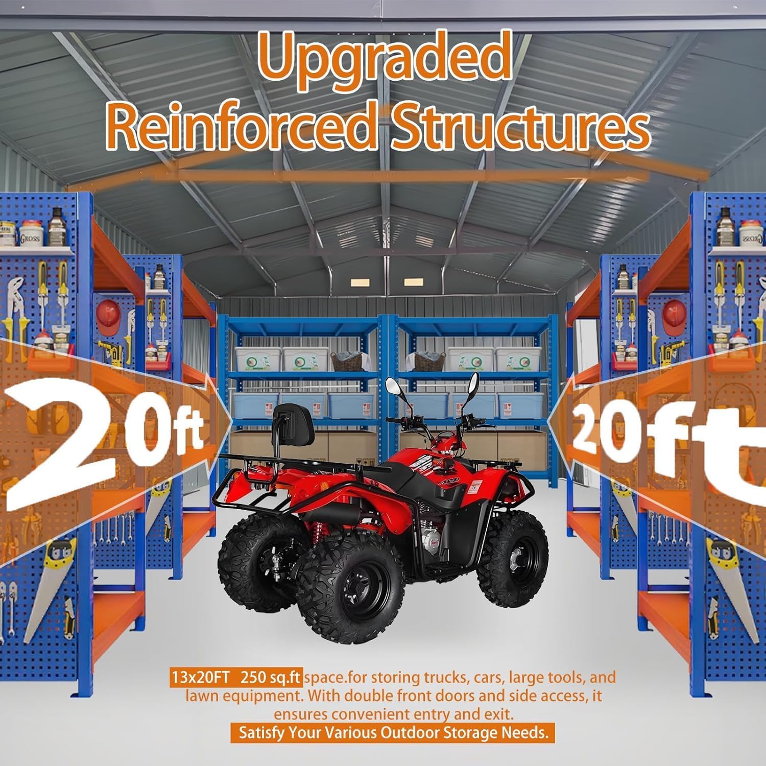 - Heavy Duty Metal Garage for Ultimate Protection: Built with 1mm powder-coated steel tubing, this metal garage offers exceptional strength and longevity. The metal shed 13x20 FT provides secure storage for vehicles and valuables with its lockable doors and reinforced structure. Whether you need an outdoor shed for equipment or a protected space for your car, this unit delivers reliable performance year after year.